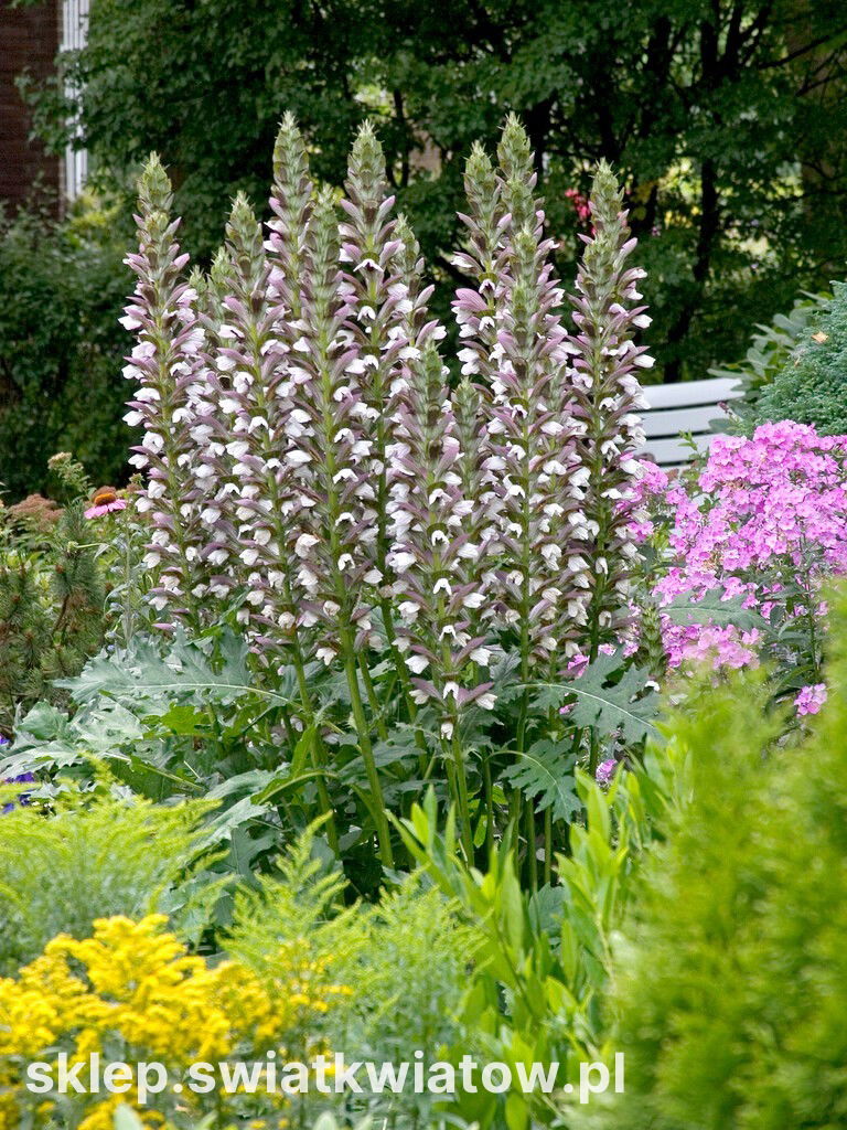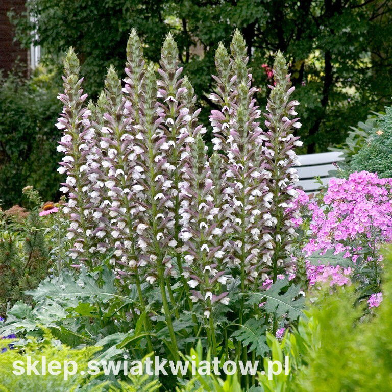 Akant miękki z łac. Acanthus mollis jest rośliną wieloletnią. Jego pędy mogą dorastać do 2 metrów, ale w naszych warunkach klimatycznych jest średnio o połowę mniejszy. Okazale, bogato ulistnione rozety pięknie dekorują ogród, nawet przed kwitnieniem roślin. Ciemnozielone, mocno powcinane liście o słabym połysku układają się w szerokie okręgi. Latem, od lipca do sierpnia, rośliny zaczynają kwitnienie. Strzeliste łodygi pokryte gęstymi fioletowo – białymi dwuwargowymi kwiatami. Akant miękki przywabia roje motyli i pszczół - jest miododajny. Gatunek wykorzystuje się jako oryginalną dekorację rabat, ogrodów skalnych, nasadzeń naturalistycznych czy wielkich donic i skrzyń. Wspaniale prezentuje się w większych grupach i jako soliter. Akant miękki jest majestatycznie wyglądającą byliną, która przyciągnie wzrok do wybranego puntu w ogrodzie.
