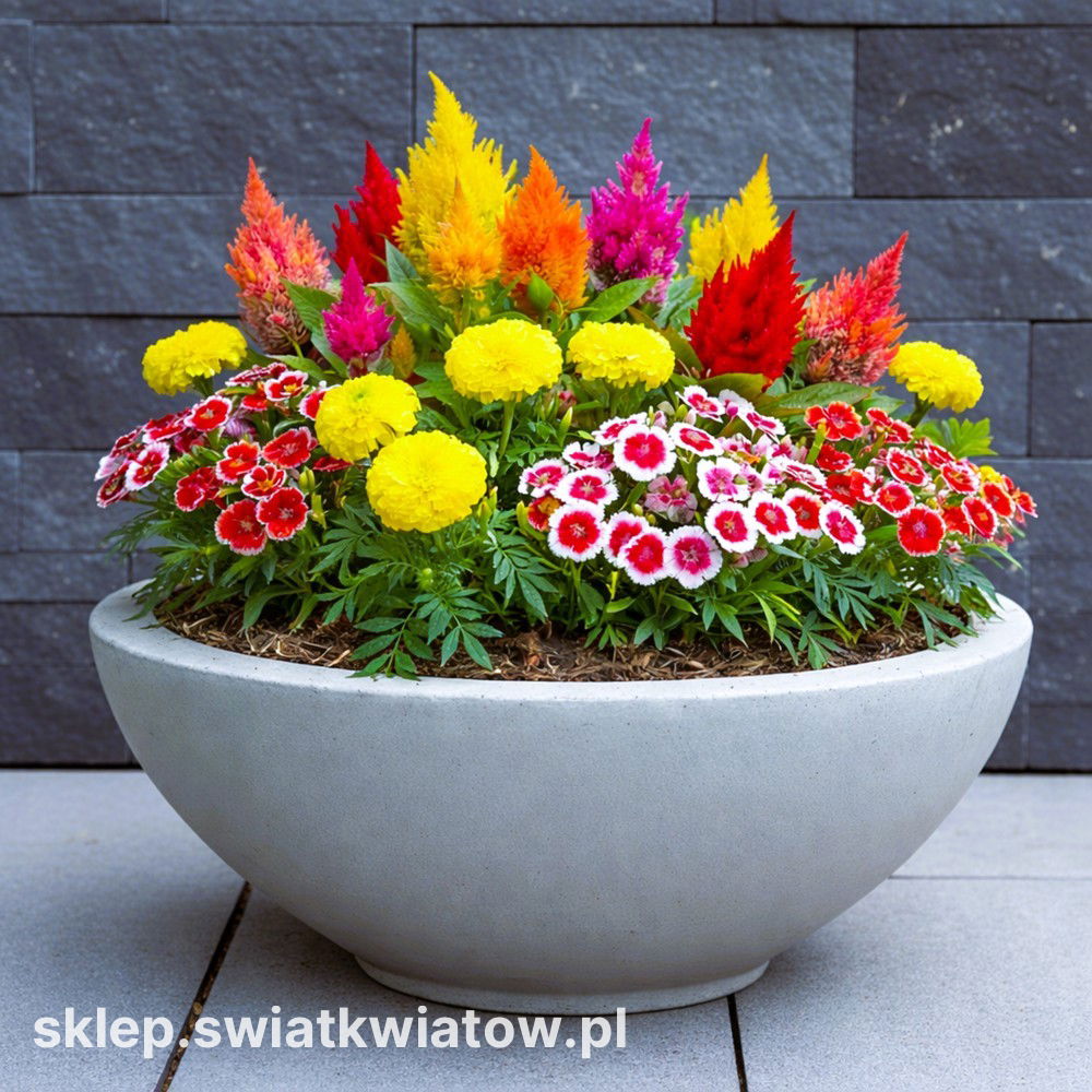 W skład zestawu wchodzą 3 gatunki nasion kwiatów: Celozja pierzasta, goździk chiński Merry Go-Round, aksamitka wzniesiona cytrynowożółta.