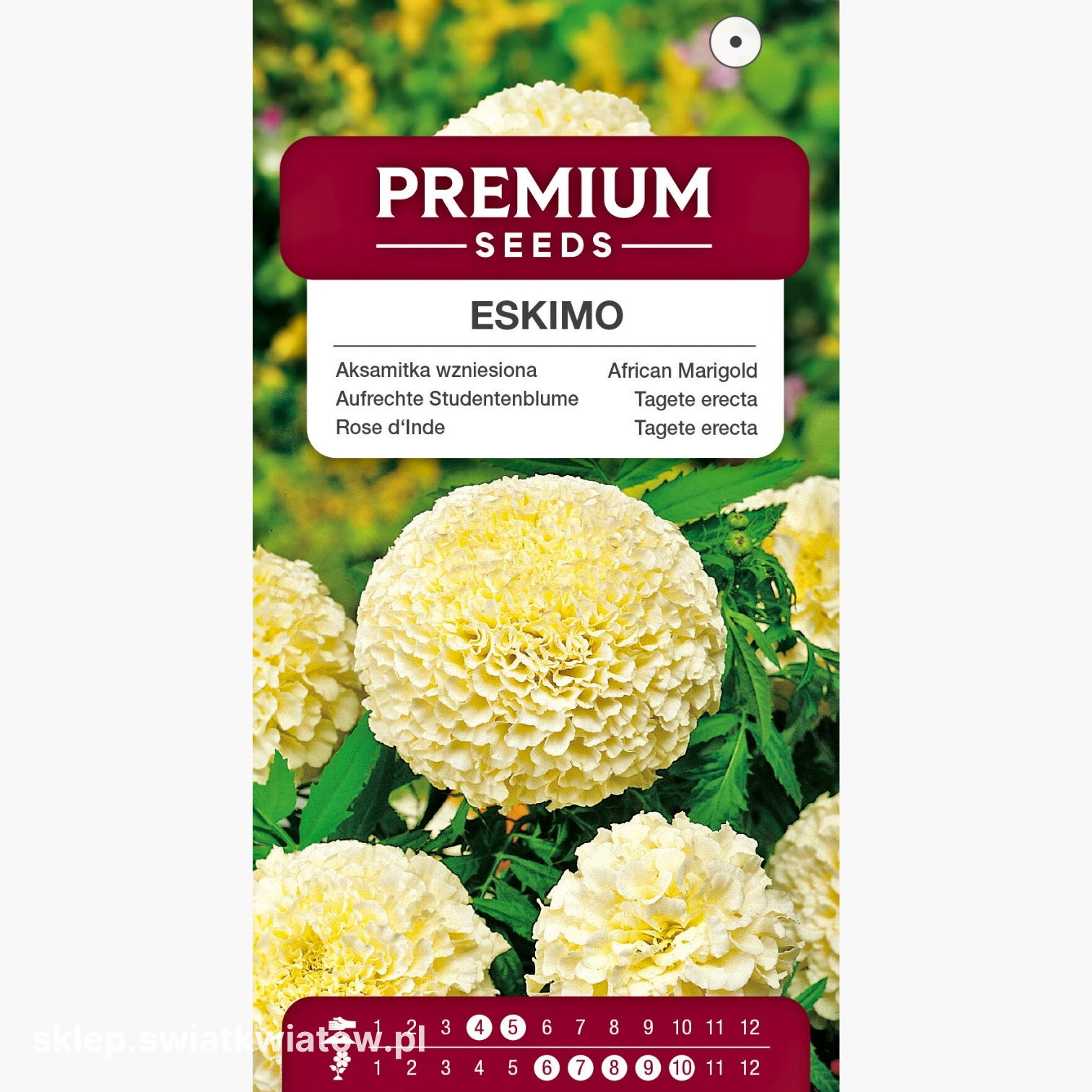 Aksamitka Eskimo to niezwykle dekoracyjna, jednoroczna roślina, która wnosi do każdego ogrodu nutę elegancji i świeżości. Dorasta do 35 cm wysokości, tworząc zwarte, krzaczaste kępy o bujnych, rozgałęzionych pędach. To właśnie na ich szczytach rozkwitają duże, pełne kwiatostany o kremowobiałej, subtelnie waniliowej barwie - kwiaty, które zachwycają swoją delikatnością i wyjątkowym urokiem. Odmiana Eskimo kwitnie długo i obficie, od czerwca aż do października, nieustannie rozświetlając rabaty, obwódki oraz donice jasnymi tonami. Jej pastelowe barwy pięknie komponują się z intensywnie kolorowymi gatunkami, tworząc harmonijną, pełną wdzięku aranżację ogrodu.