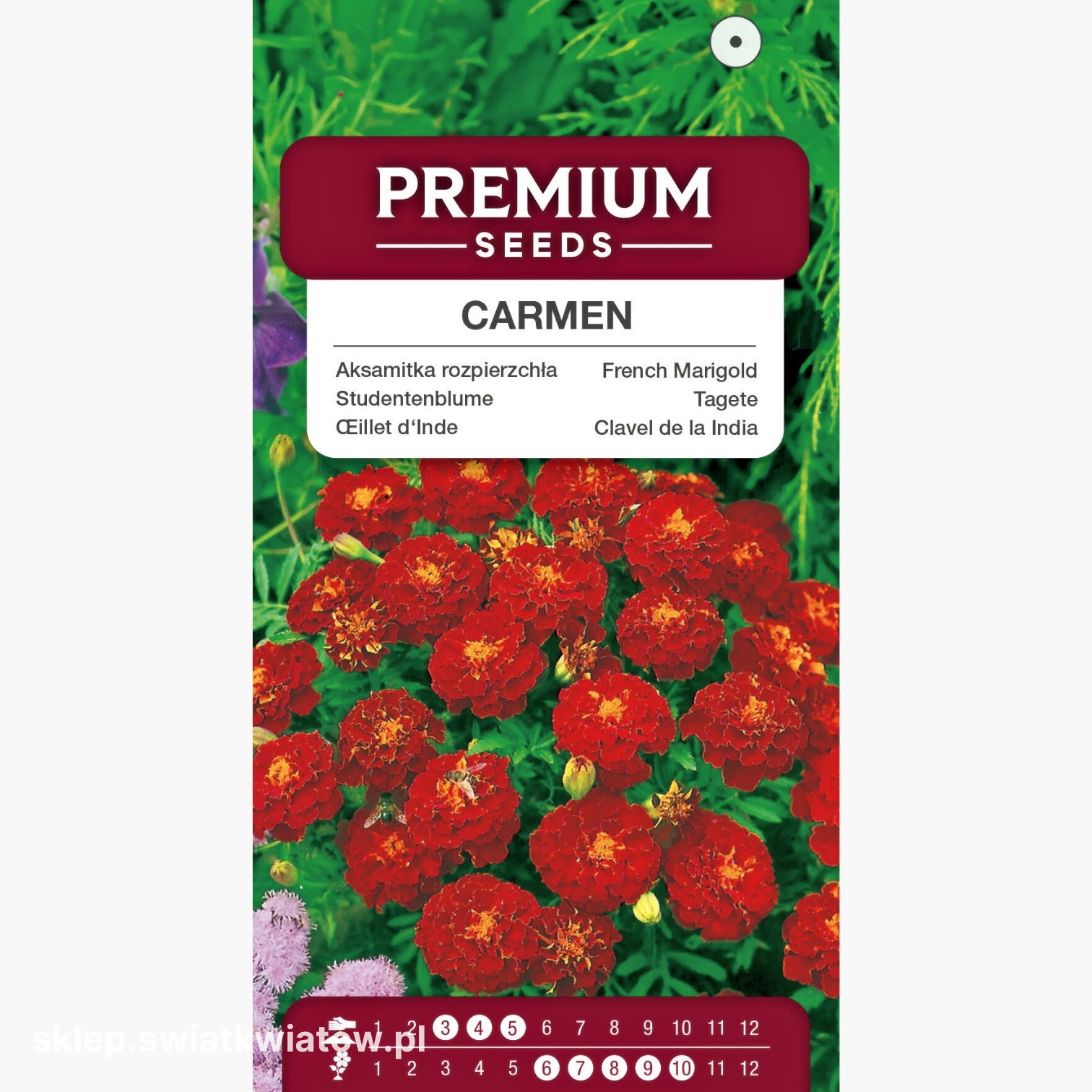 Aksamitka Carmen kwitnie od czerwca do października. Jej kwiaty rozwijają się nawet do pierwszych przymrozków, zapewniając długotrwały efekt dekoracyjny.