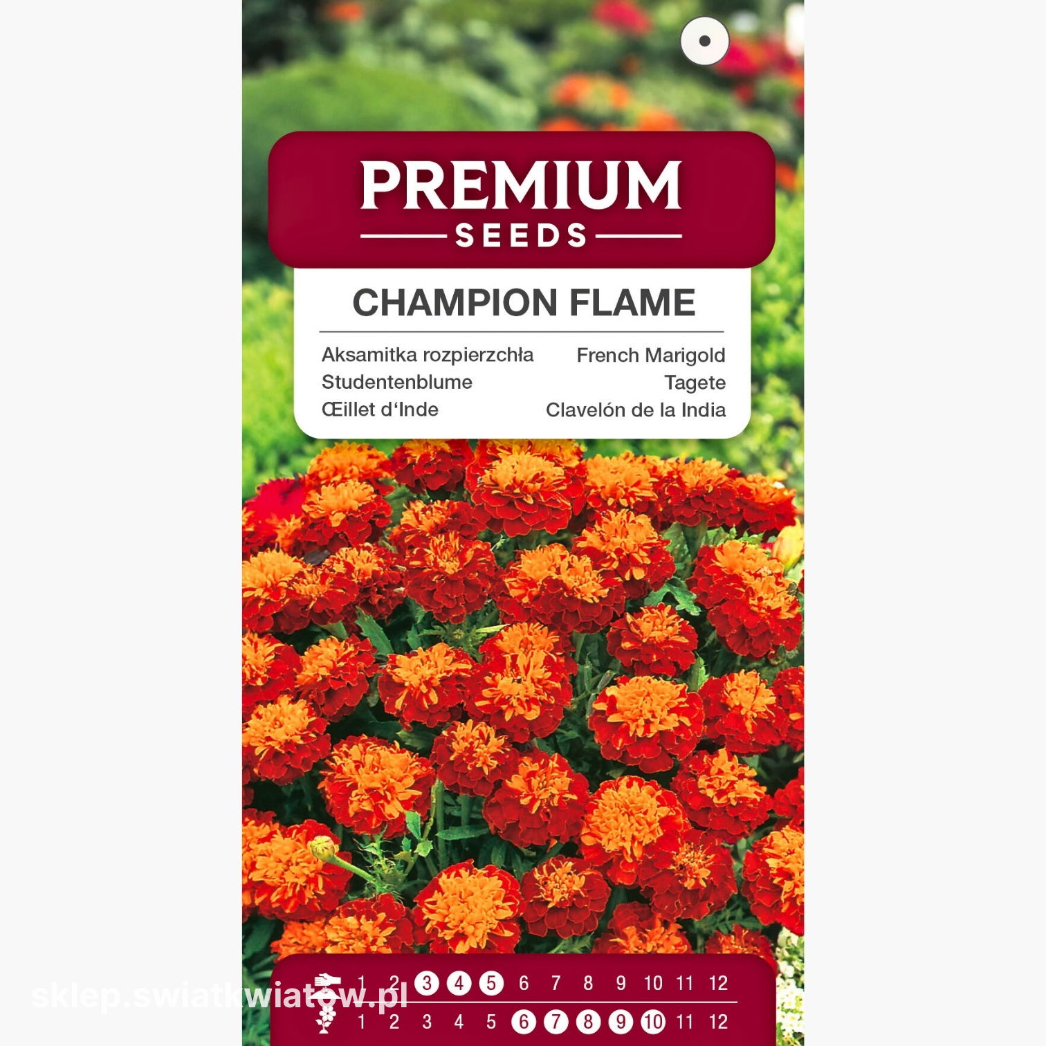 Aksamitka rozpierzchła Champion Flame (Tagetes patula nana) to odmiana silnie karłowa, która osiąga maksymalnie 20 cm wysokości. Kompaktowa roślina o zwartym, kulistym pokroju, która tworzy niezwykle atrakcyjne pełne, dwubarwne kwiatostany. Bardzo cenna roślina ozdobna, popularna ze względu na wczesne i długotrwałe kwitnienie. Mahoniowo-złociste kwiaty zdobią rośliny od wiosny do jesiennych mrozów. Niska aksamitka Champion Flame może być sadzona na brzegach rabat, doda koloru ogrodowym kwietnikom i rabatom. Posadzona w donicach i skrzynkach świetnie sprawdzi się jako ozdoba balkonu lub parapetu okiennego.
