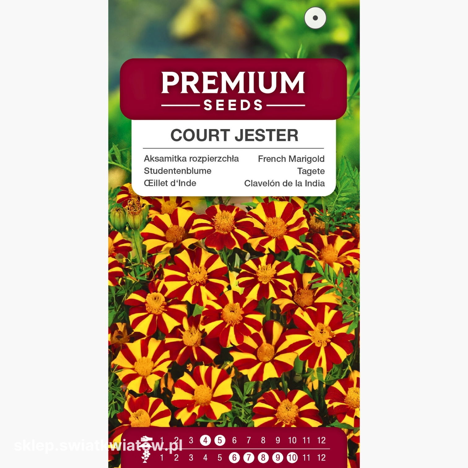 Aksamitka rozpierzchła Court Jester to niezwykle atrakcyjna roślina jednoroczna, która zachwyca swoją niepowtarzalną kolorystyką. Jej kwiaty, o wyrazistych żółto-bordowych pasach, przyciągają wzrok i wprowadzają do ogrodu żywiołowy akcent. Dzięki silnie rozgałęzionym pędom, aksamitka osiąga wysokość około 50 cm, co czyni ją doskonałym wyborem na rabaty, kwietniki oraz do pojemników. Jej długie i obfite kwitnienie od czerwca do października sprawia, że jest niezastąpioną ozdobą przez całe lato. Warto zwrócić uwagę na tę odmianę, która nie tylko upiększy przestrzeń, ale także zyska uznanie wśród miłośników ogrodnictwa.