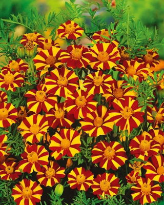 Aksamitka rozpierzchła Court Jester dorasta do wysokości około 50 cm. Dzięki temu jest idealna do tworzenia różnorodnych kompozycji ogrodowych.