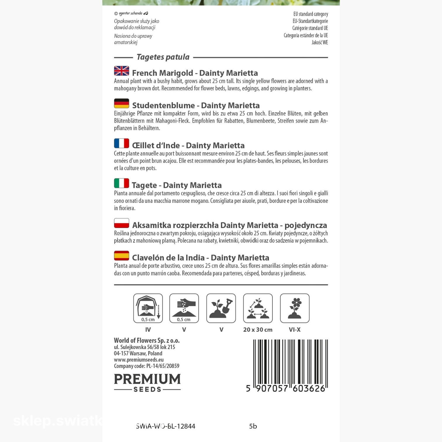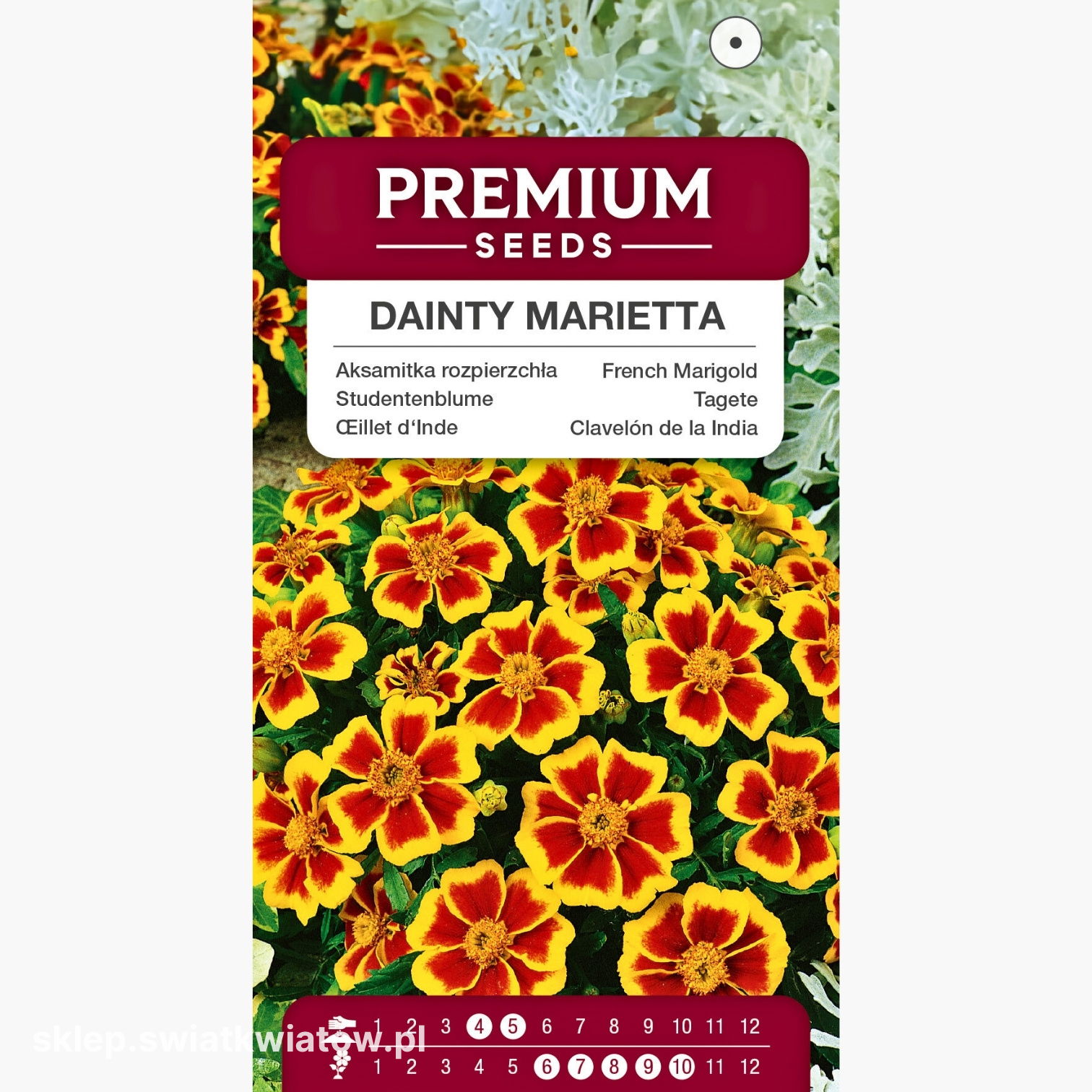 Aksamitka Dainty Marietta kwitnie nieprzerwanie od czerwca do października. Jej kwiaty doskonale kontrastują z zielenią liści, zdobiąc ogród nawet w mniej sprzyjających warunkach pogodowych. To jedna z najdłużej kwitnących odmian wśród aksamitek.