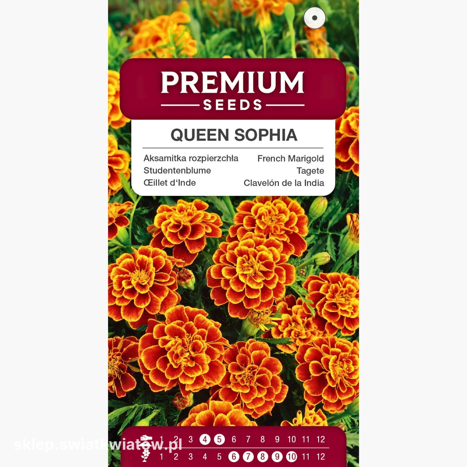Aksamitka Queen Sophia kwitnie nieprzerwanie od czerwca do października. To jedna z najbardziej niezawodnych odmian - nawet pod koniec sezonu jej kwiaty pozostają świeże, pełne koloru i wdzięku.