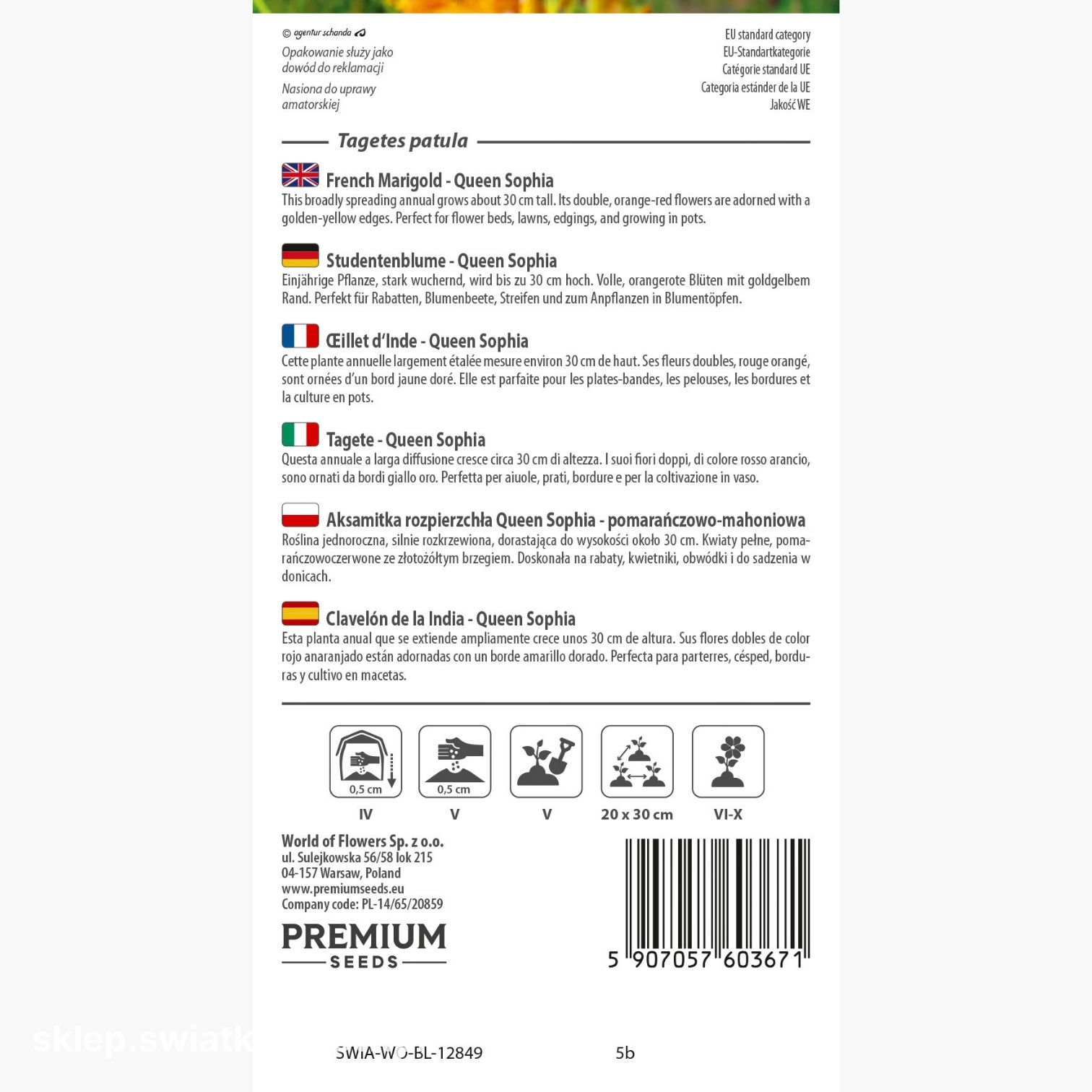 Nasiona aksamitki Queen Sophia wysiewaj na głębokość około 0,5 cm. To optymalna głębokość, która zapewni szybkie i równomierne kiełkowanie.