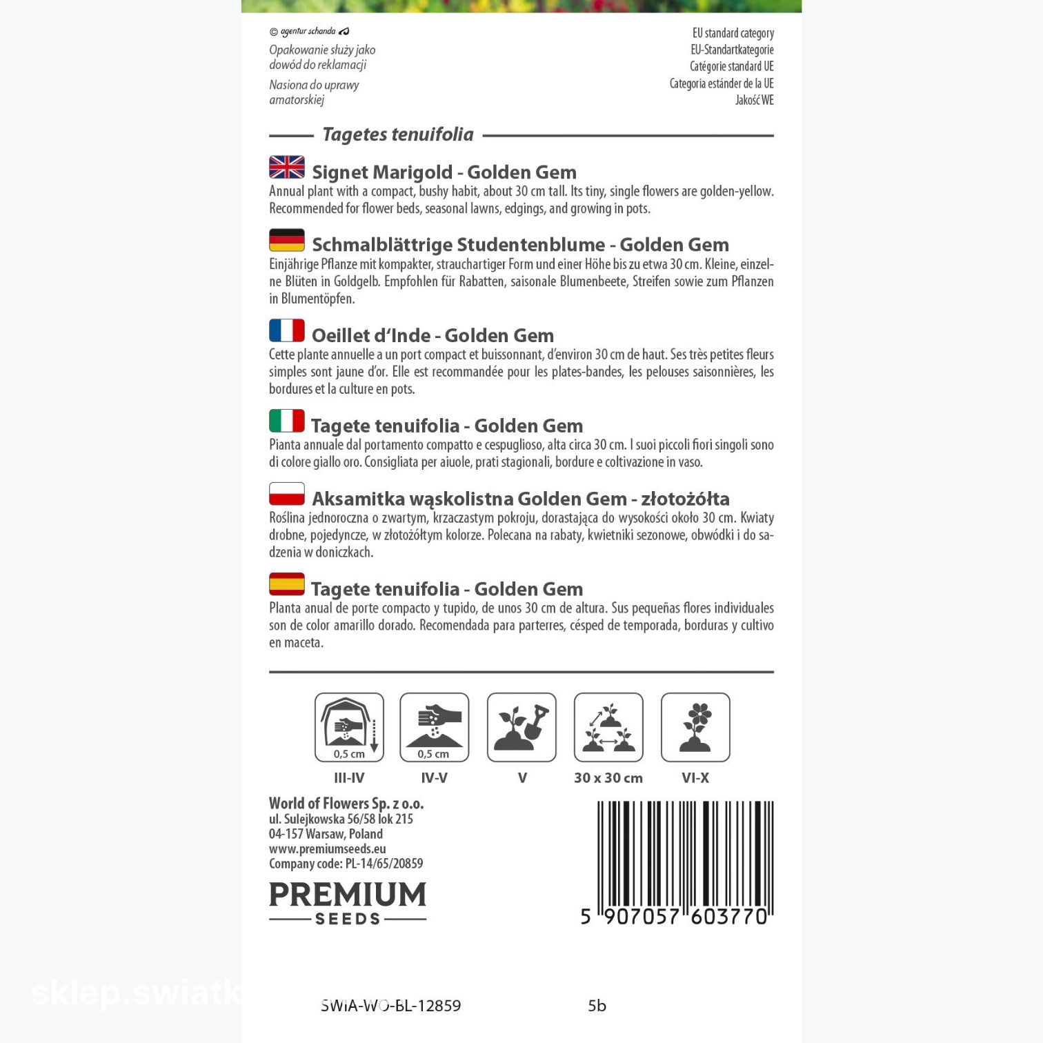 Nasiona aksamitki Golden Gem wysiewa się na głębokość około 0,5 cm. Taka warstwa gleby zapewnia równomierne kiełkowanie i silny wzrost młodych siewek.