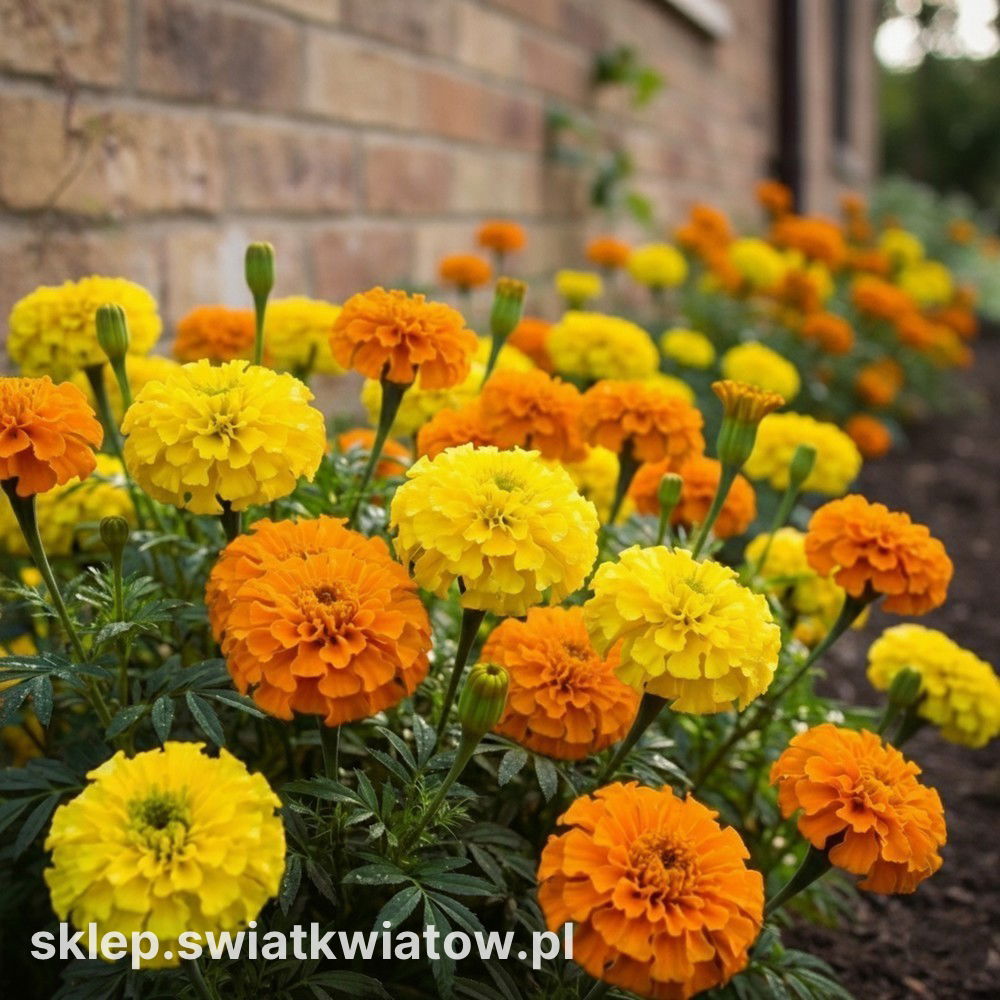 W skład zestawu wchodzą 2 odmiany nasion kwiatów: aksamitka wzniesiona cytrynowożółta oraz pomarańczowa.