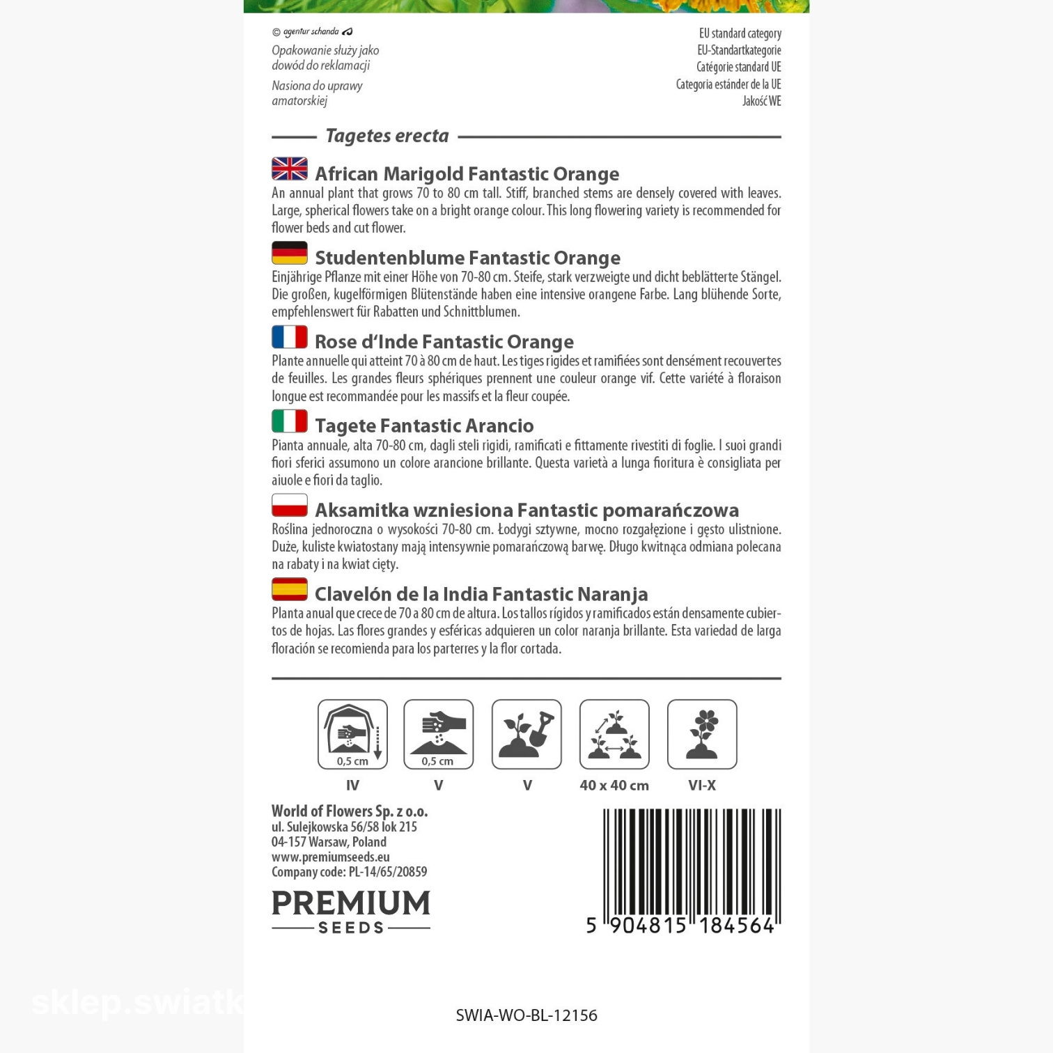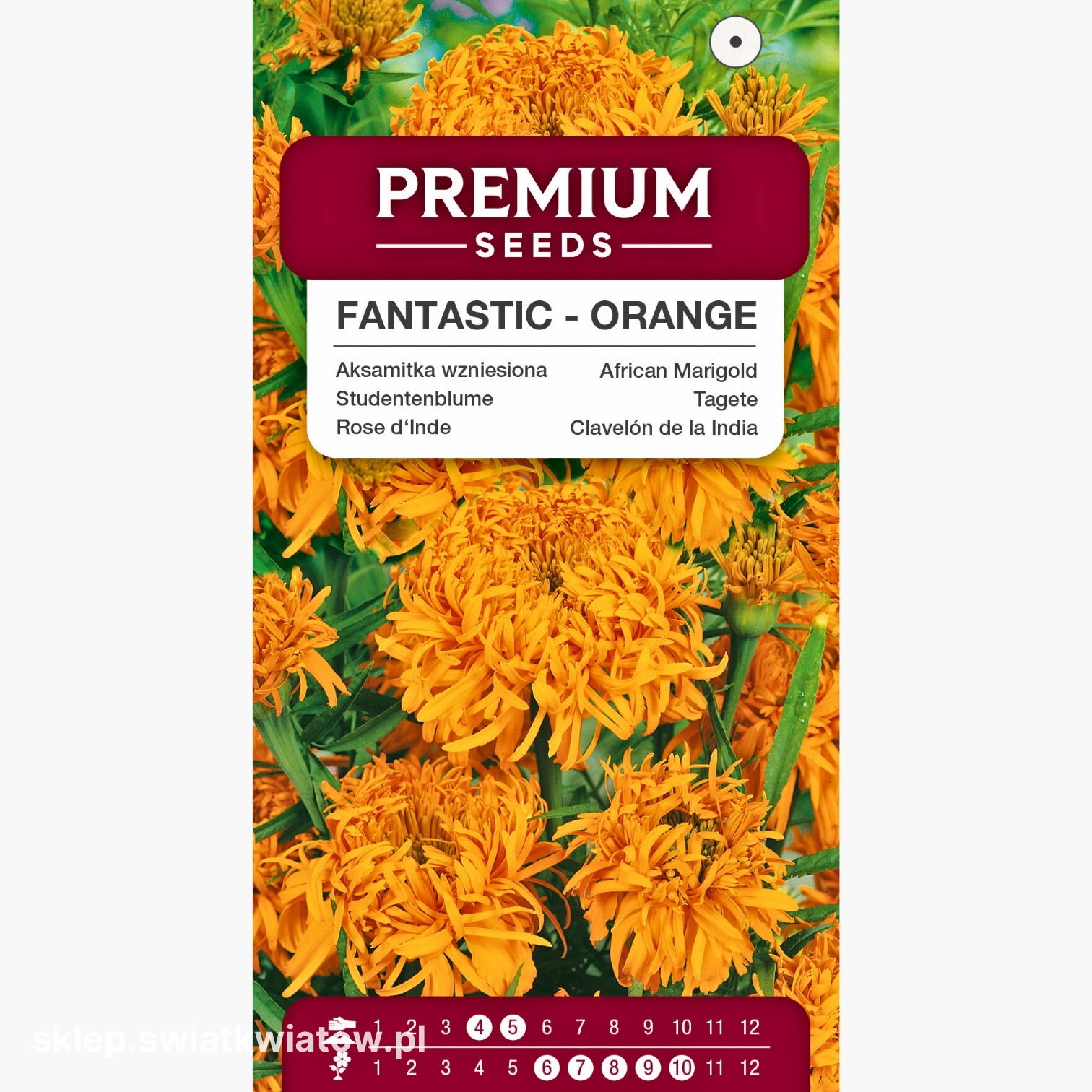 Aksamitka Fantastic (Tagetes erecta) to wyjątkowo efektowna roślina jednoroczna, która wnosi do ogrodu mocny, pomarańczowy akcent. Zachwyca swoim dużymi, kulistymi i pełnymi kwiatostanami o charakterystycznie zawiniętych ku środkowi płatkach języczkowatych. Osiągając 70–80 cm wysokości i tworząc sztywne, mocno rozgałęzione łodygi, doskonale sprawdza się zarówno na wysokich rabatach, jak i jako kwiat cięty. Kwitnie obficie od początku lata aż do pierwszych przymrozków, zachwycając intensywną barwą i trwałością.