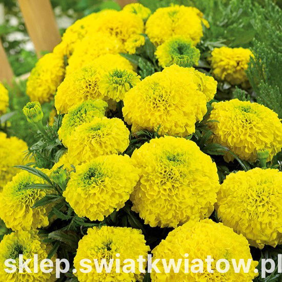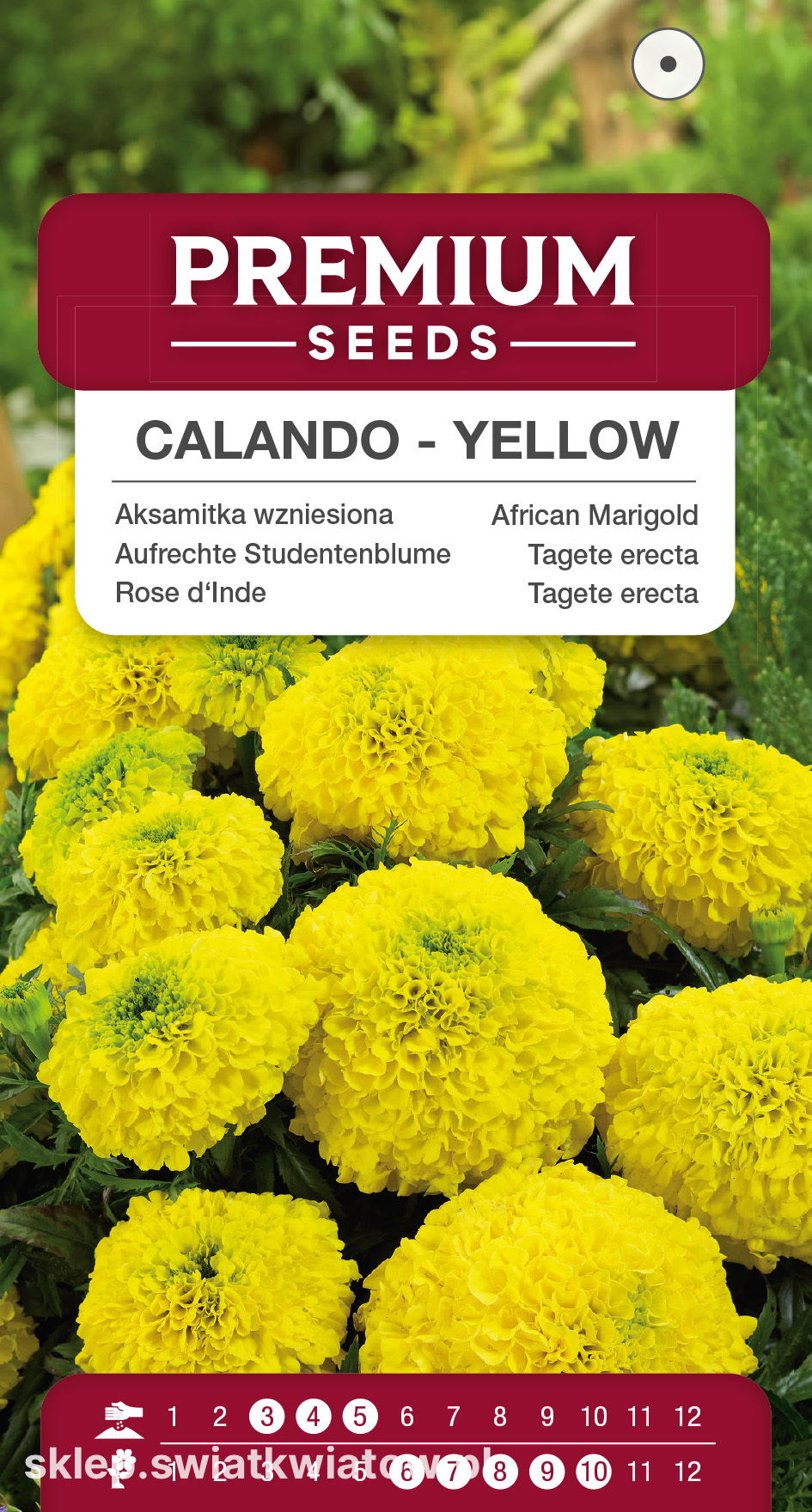 Aksamitka wzniesiona karłowa Calando (Tagetes erecta) o kwiatach w żółtym kolorze. Rośliny z grupy Calando charakteryzują się niewielką wysokością, mają maksymalnie 30 cm. Tworzą okazałe, pełne kwiatostanu o średnicy 5-6 cm. Jednobarwne intensywnie żółte kwiaty zebrane są w kuliste koszyczki. Ta karłowa odmiana będzie się świetnie prezentować na niskiej rabacie w otoczeniu innych niskich kwiatów lub posadzona na jej brzegu. Calando może być również wykorzystana do kwiatowych kompozycji rosnących na słonecznych balkonach i tarasach.