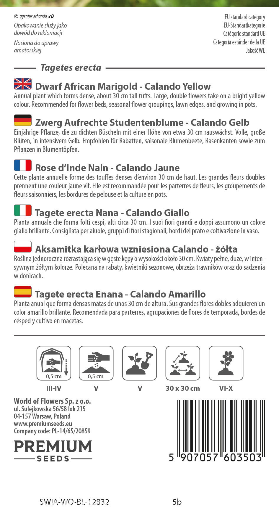 W każdej paczce znajduje się 0,4 g nasion aksamitki wzniesionej karłowej Calando - żółtej. Opakowanie zawiera informacje o zasadach uprawy oraz o terminie przydatności do siewu.