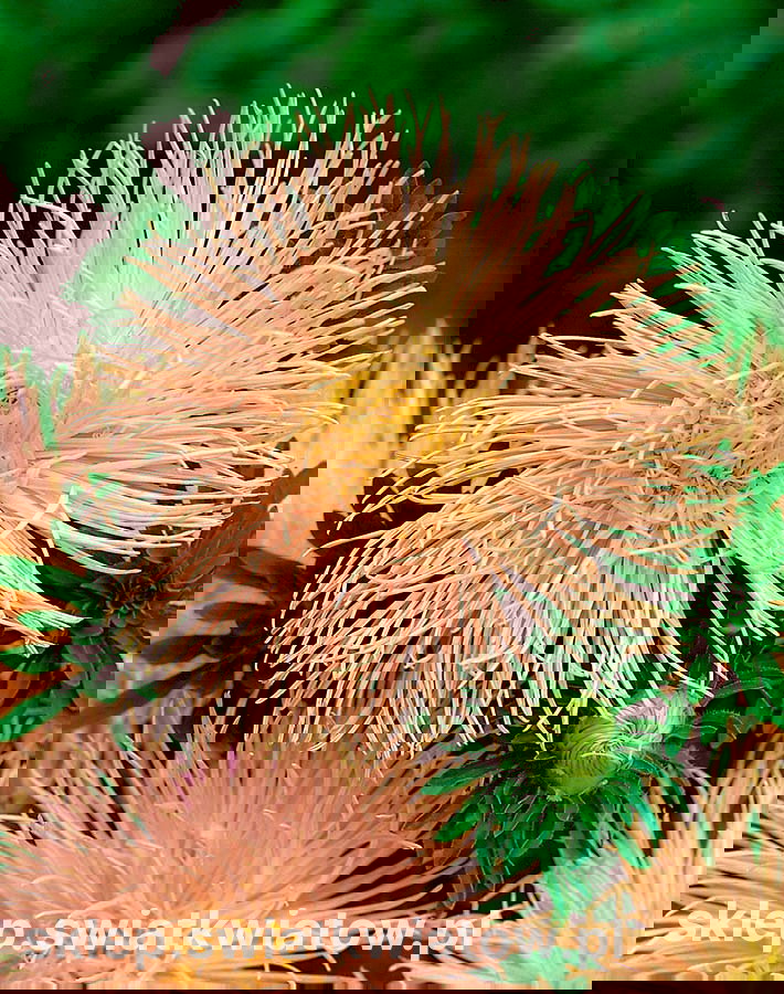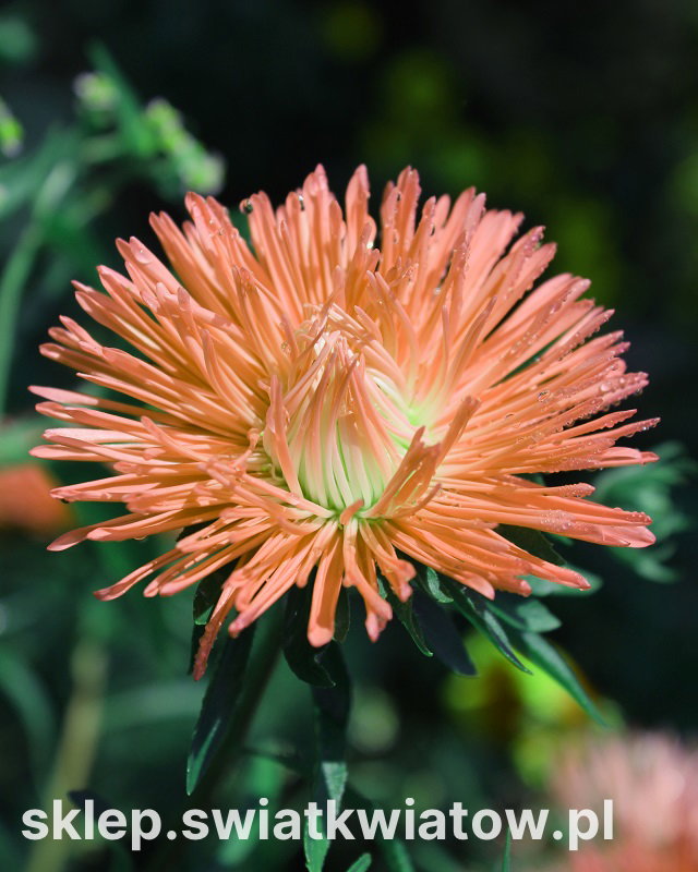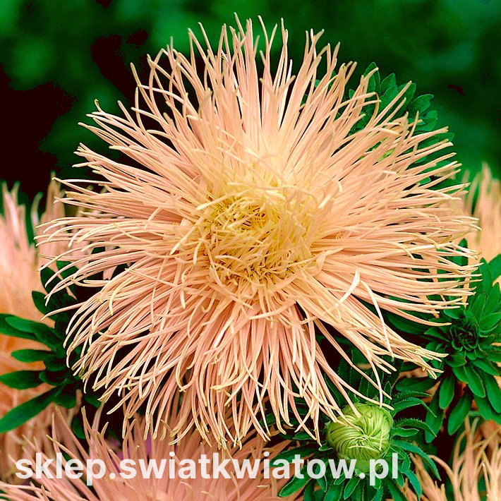 Aster chiński igiełkowy Ewa (Callistephus chinensis) urocza odmiana, której kwiaty wyglądają jakby składały się z masy drobnych igiełek. Kwiaty w delikatnym i subtelnym łososioworóżowym kolorze z całą pewnością będą przyciągać wzrok. Roślina jednoroczna, która osiąga wysokość 40-60 cm. Odmiana ceniona za obfite i długotrwałe kwitnienie, a przede wszystkim za kwiaty o niezwykle subtelnej barwie i średnicy 14-16 cm. Aster chiński to jeden z piękniejszych kwiatów na letnie rabaty i kwietniki, najchętniej sadzony z przeznaczeniem na kwiat cięty.