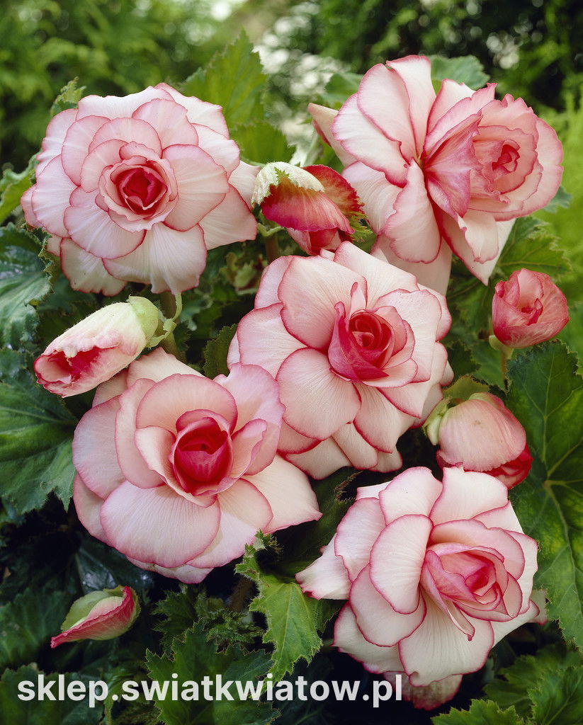 Begonia biało-różowa Picotee White to odmiana o okazałych dwubarwnych kwiatach. Zachwyca przepięknymi pełnymi kwiatami, które pojawiają się obficie od lipca nawet do października. Duże kwiaty rozwijają się pojedynczo lub po kilka w kątach mięsistych liści. Delikatne płatki tej begonii są białe, a ich brzegi zdobi różowa obwódka. Rośliny dobrze się rozkrzewiają przybierając postać gęstych krzaczków, ich wysokość dochodzi do 25-40 cm. Begonia biało-różowa Picotee White będzie wspaniałą ozdobą skrzynek i donic ustawionych na tarasie, balkonie czy w altanie, można ją również posadzić na ogrodowej rabacie.