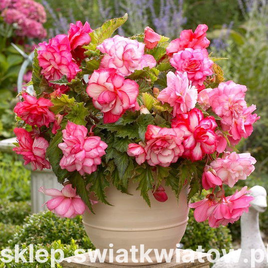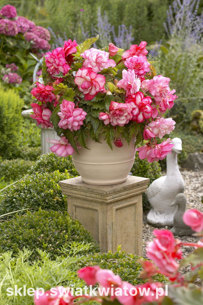 Begonia Pink Balcony o pełnych kwiatach w odcieniach różu rozweseli każdy, nudny balkon lub tras. Idealnie nadaje się do sadzenia w wiszących pojemnikach, w których jej przewieszające się pędy będą dobrze wyeksponowane. Odmiana Pink Balcony dorasta do wysokości 30-40 cm. Posadź kilka sztuk w wiszących koszach, skrzynkach balkonowych czy donicach i stwórz małą oazę wypełnioną kolorami. Kaskada pełnych kwiatów będzie cieszyć nasze oczy przez całe lato, rośliny kwitną obficie od czerwca do października.