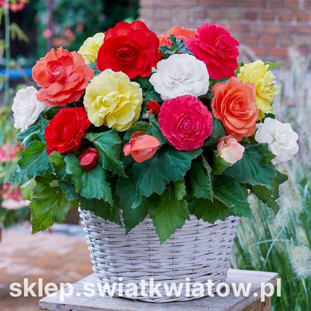 Oferta sprzedaży dotyczy begonii wielkokwiatowej Superba w miksie kolorów. W zestawie znajduje się 100 sztuk bulw. Na etykiecie produktu znajdują się informacje o roślinie i jej uprawie.