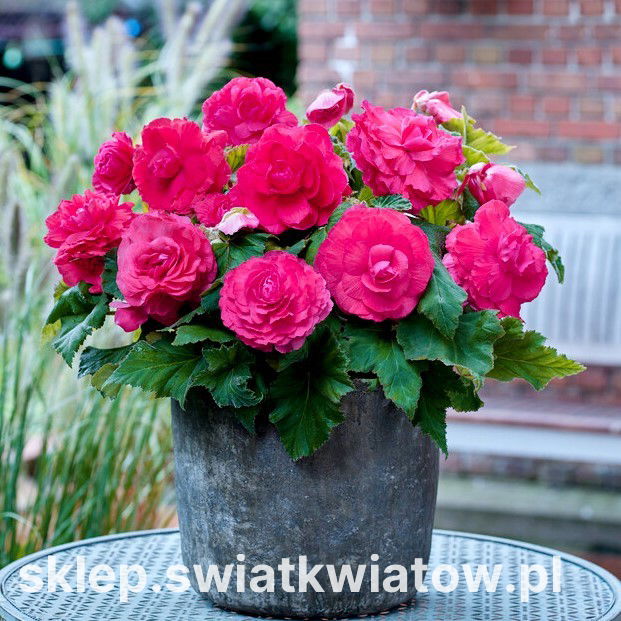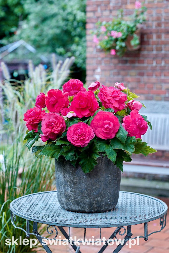 Begonia bulwiasta wielkokwiatowa (Begonia x tuberhybrida grandiflora) Superba Rose jest odmianą oferującą ogromne, podwójne kwiaty w odcieniu różu. Niewysokie rośliny o ukośnych liściach z ząbkowanymi brzegami kwitną przez całe lato aż do jesiennego ochłodzenia. Ta rewelacyjna grupa begonii zachwyca ogrodników ilością i wyglądem swoich kwiatów, naśladujących rozwinięte róże. Nasycona, jednolita barwa płatków ułożonych w zgrabne okręgi jest widoczna z daleka na tle zielonego ulistnienia. Najwięcej kwiatów pojawia się na górnej części pędów, w kątach liści. Grube i kruche łodygi tworzą zwarty, krzaczkowaty pokrój rośliny. Begonie wielkokwiatowe to niezastąpione rośliny do sadzenia na frontach rabat, obwódkach czy eleganckich klombach położonych na mniej nasłonecznionych terenach. Ten szlachetny kwiat fenomenalnie nadaje się obsadzania donic, pojemników, wiszących koszy i skrzynek. Begonię bulwiastą można też traktować jako kwitnącą roślinę doniczkową.