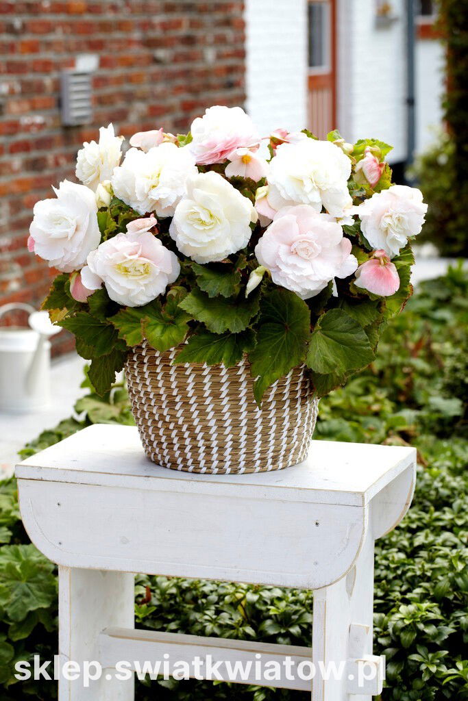Begonia bulwiasta wielkokwiatowa (Begonia x tuberhybrida grandiflora) Superba White jest odmianą oferującą ogromne, podwójne kwiaty w eleganckiej czysto białej barwie. Niewysokie rośliny o ukośnych liściach z ząbkowanymi brzegami kwitną przez całe lato aż do jesiennego ochłodzenia. Ta rewelacyjna grupa begonii zachwyca ogrodników ilością i wyglądem swoich kwiatów, naśladujących rozwinięte róże. Nasycona, jednolita barwa płatków ułożonych w zgrabne okręgi jest widoczna z daleka na tle zielonego ulistnienia. Najwięcej kwiatów pojawia się na górnej części pędów, w kątach liści. Grube i kruche łodygi tworzą zwarty, krzaczkowaty pokrój rośliny. Begonie wielkokwiatowe to niezastąpione rośliny do sadzenia na frontach rabat, obwódkach czy eleganckich klombach położonych na mniej nasłonecznionych terenach. Ten szlachetny kwiat fenomenalnie nadaje się obsadzania donic, pojemników, wiszących koszy i skrzynek. Begonię bulwiastą można też traktować jako kwitnącą roślinę doniczkową.