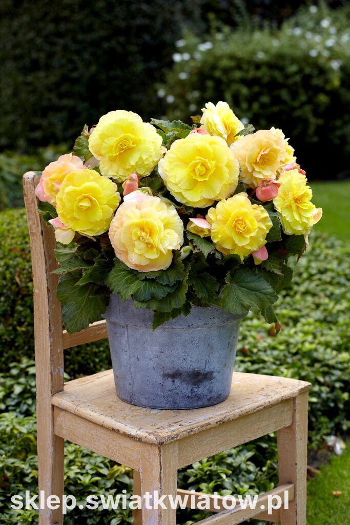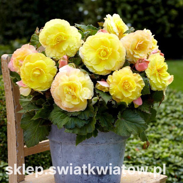 Begonia bulwiasta wielkokwiatowa (Begonia x tuberhybrida grandiflora) Superba Yellow jest odmianą oferującą ogromne, podwójne kwiaty w odcieniu słonecznej żółci. Niewysokie rośliny o ukośnych liściach z ząbkowanymi brzegami kwitną przez całe lato aż do jesiennego ochłodzenia. Ta rewelacyjna grupa begonii zachwyca ogrodników ilością i wyglądem swoich kwiatów, naśladujących rozwinięte róże. Nasycona, jednolita barwa płatków ułożonych w zgrabne okręgi jest widoczna z daleka na tle zielonego ulistnienia. Najwięcej kwiatów pojawia się na górnej części pędów, w kątach liści. Grube i kruche łodygi tworzą zwarty, krzaczkowaty pokrój rośliny. Begonie wielkokwiatowe to niezastąpione rośliny do sadzenia na frontach rabat, obwódkach czy eleganckich klombach położonych na mniej nasłonecznionych terenach. Ten szlachetny kwiat fenomenalnie nadaje się obsadzania donic, pojemników, wiszących koszy i skrzynek. Begonię bulwiastą można też traktować jako kwitnącą roślinę doniczkową.
