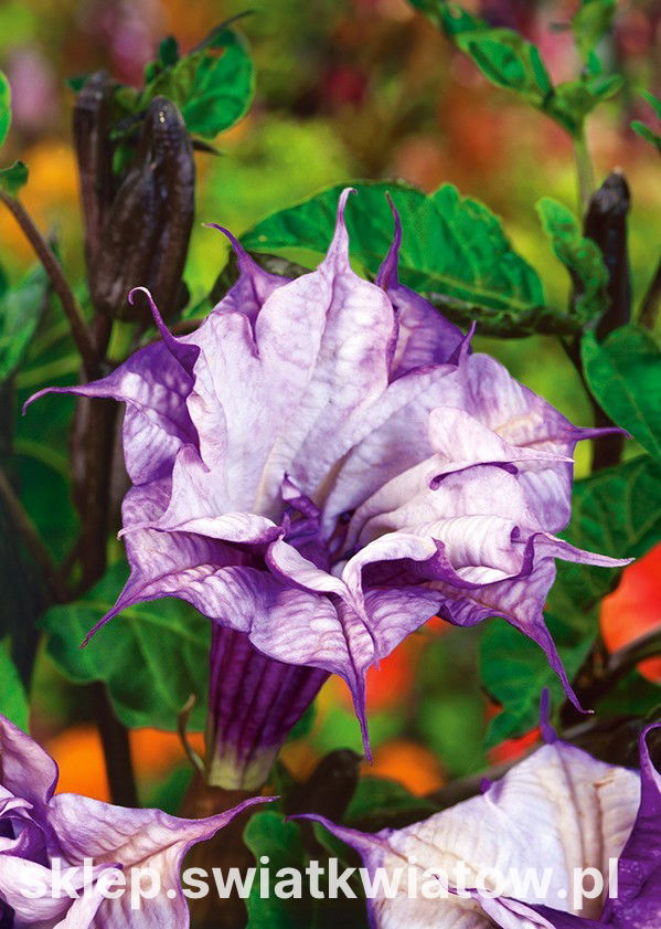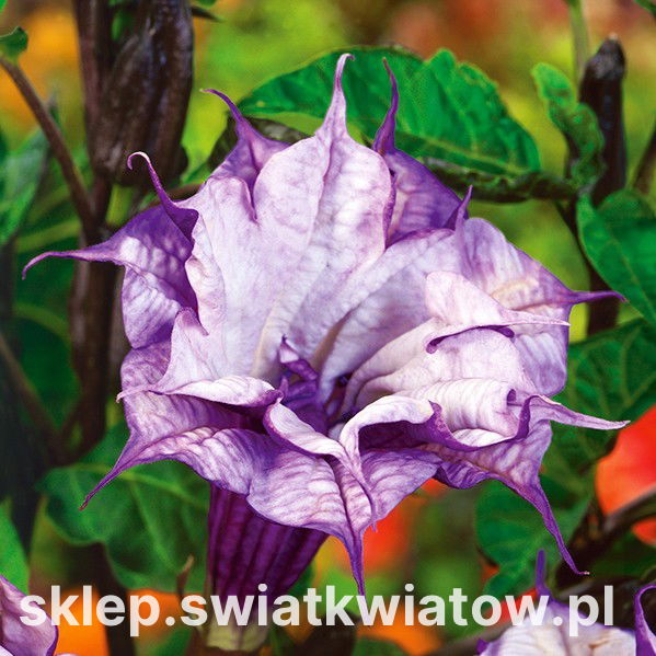 Bieluń surmikwiat Ballerina (Datura metel) to jednoroczna roślina o dużych, fioletowo-białych kwiatach w kształcie trąbek. Płatki są wyraźnie pofalowane i lekko karbowane, co nadaje im efektowny, egzotyczny wygląd. Roślina tworzy wyprostowany, dobrze rozgałęziony pokrój, który świetnie prezentuje się na rabatach i w dużych pojemnikach.