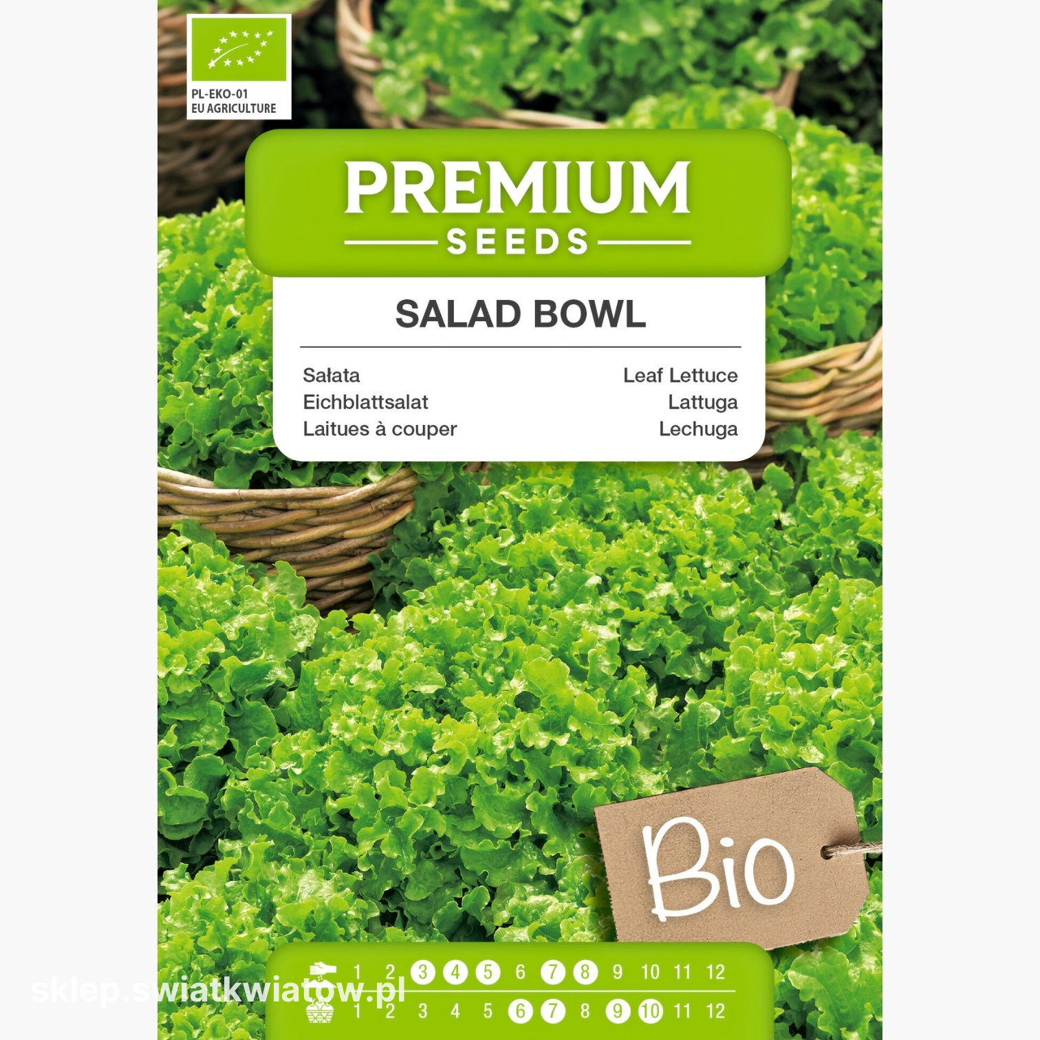 Opakowanie zawiera 0,5 g nasion BIO sałaty liściowej Salad Bowl, informacje na temat daty przydatności nasion do siewu i zasady uprawy.