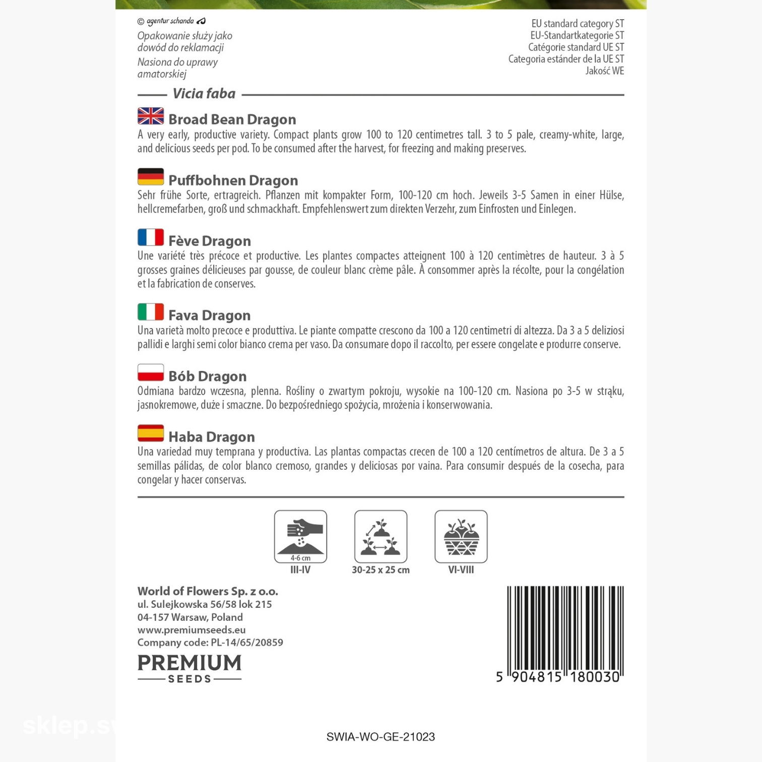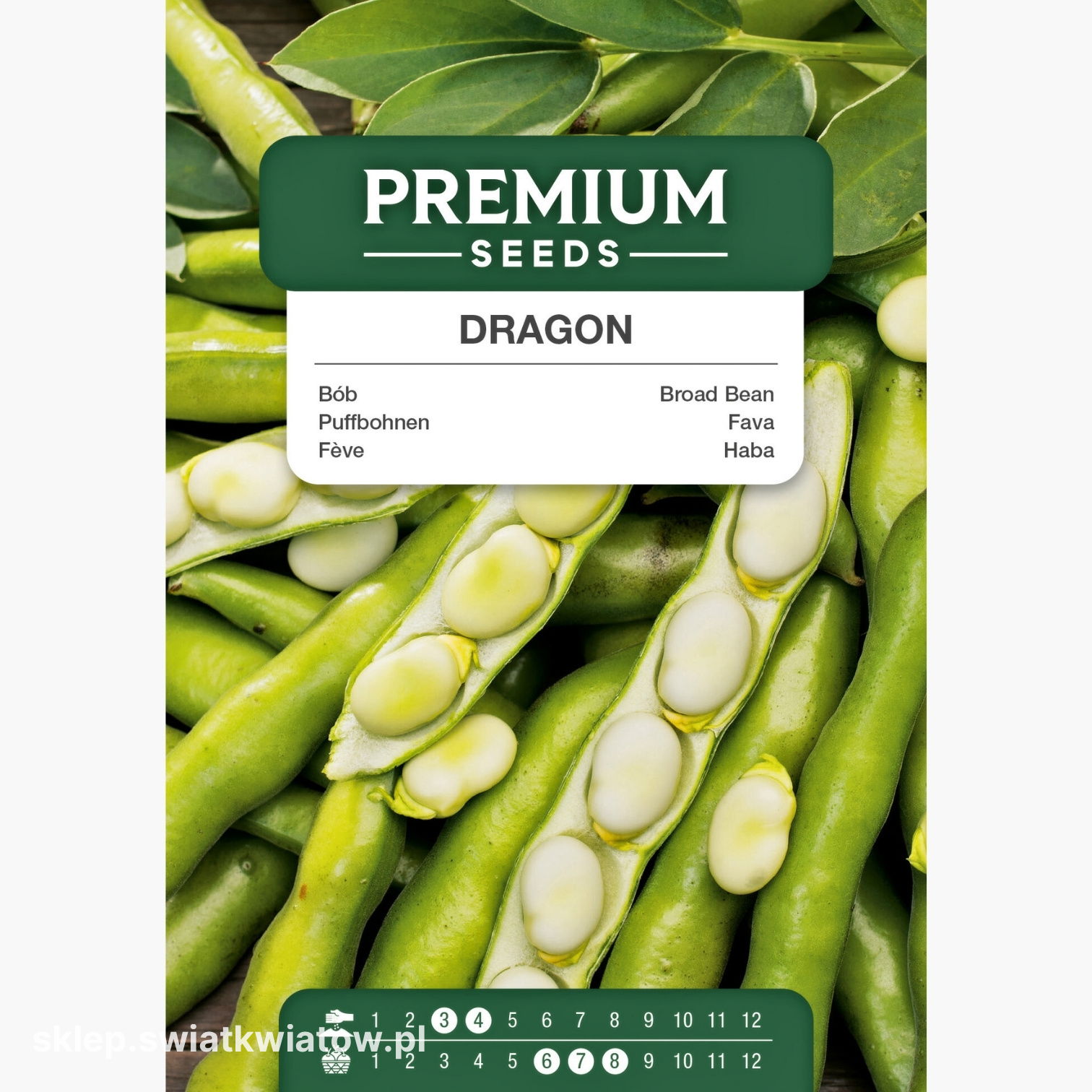Bób Dragonto odmiana szczególnie polecana dla ogrodników ceniących wczesne zbiory i wysoką plenność. Rośliny charakteryzują się zwartym pokrojem oraz imponującą wysokością dochodzącą do 120 cm. Odmiana Dragon należy do bardzo wczesnych, od momentu wysiewu nasion do zbioru dojrzałych strąków mija zaledwie około 75-80 dni. Bób ten wyróżnia się równomiernym dojrzewaniem strąków, co ułatwia zbiory i wpływa na wysoką jakość plonów. Roślina zawiązuje długie, sięgające nawet 15 cm, szerokie strąki, które mieszczą od 3 do 5 dużych, jasnokremowych nasion o owalnym, lekko spłaszczonym kształcie. Nasiona bobu Dragon są nie tylko wyjątkowo smaczne, ale także stanowią bogate źródło białka roślinnego, co czyni je niezwykle wartościowym elementem zdrowej diety.