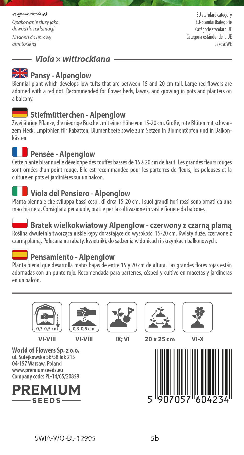 Każde opakowanie zawiera około 0,5 grama nasion bratka wielkokwiatowego czerwonego z czarną plamą. Dodatkowo na każdej paczce opisane są najważniejsze wskazówki dotyczące uprawy, a także podany jest termin przydatności nasion do siewu.