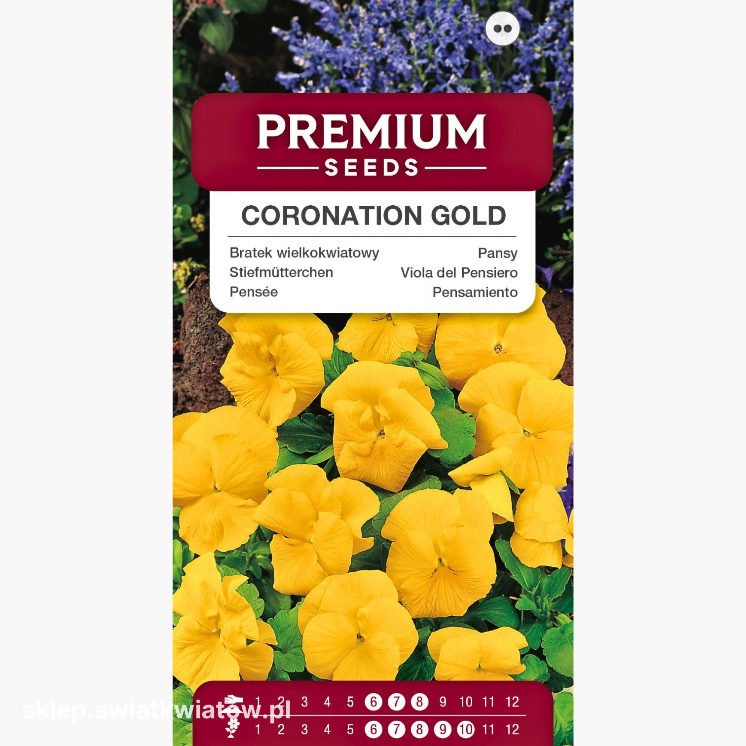 Opakowanie zawiera 0,5 g nasion bratka wielkokwiatowego Coronation Gold. Na opakowaniu znajdziesz informacje o zasadach uprawy i terminie przydatności do wysiewu.