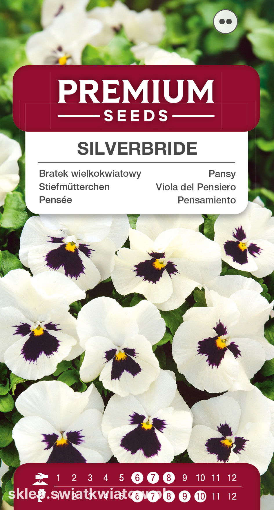 Bratek wielkokwiatowy to dwuletnia roślina osiągająca wysokość od 15 do 20 cm. Odmiana Silverbride wyróżnia się dużymi, śnieżnobiałymi kwiatami z charakterystycznym czarnym zabarwieniem w środkowej części kwiatu. Wysiew nasion należy przeprowadzić w okresie od czerwca do sierpnia na rozsadniku lub pod osłonami. Najbardziej odpowiadającym jej stanowiskiem jest w pełni nasłonecznione bądź częściowo zacienione miejsce o przepuszczalnej, wilgotnej i zasobnej w składniki pokarmowe glebie. Odmiana Silverbride jest w pełni odporna na ujemne temperatury, przez co bez przeszkód może być uprawiana przez cały rok w gruncie. Kwitnienie trwa od wczesnej wiosny do późnej jesieni. Te niepozorne, filigranowe roślinki wykorzystuje się na wiele różnych sposobów. Świetnie prezentują się na rabatach i na obwódki. Umieszczone w doniczkach i pojemnikach będą doskonałym urozmaiceniem balkonów i tarasów. Bardzo często używa się ich także do udekorowania przestrzeni miejskiej : parki, place i okolice budynków użyteczności publicznej zachwycają nas obecnością fiołków. Roślina jest również chętnie uprawiana na kwietnikach. Bratek wielkokwiatowy Silverbride posiada wszystkie cechy, jakie powinna posiadać wzorowo prezentująca się roślina. Jego piękne, biało-czarne kwiaty z pewnością wprowadzą nas w zachwyt, a w połączeniu z innymi odmianami i gatunkami będzie stanowił piękną kompozycję. Będzie to także szansa dla nas do wykazania się pomysłowością i gustem.
