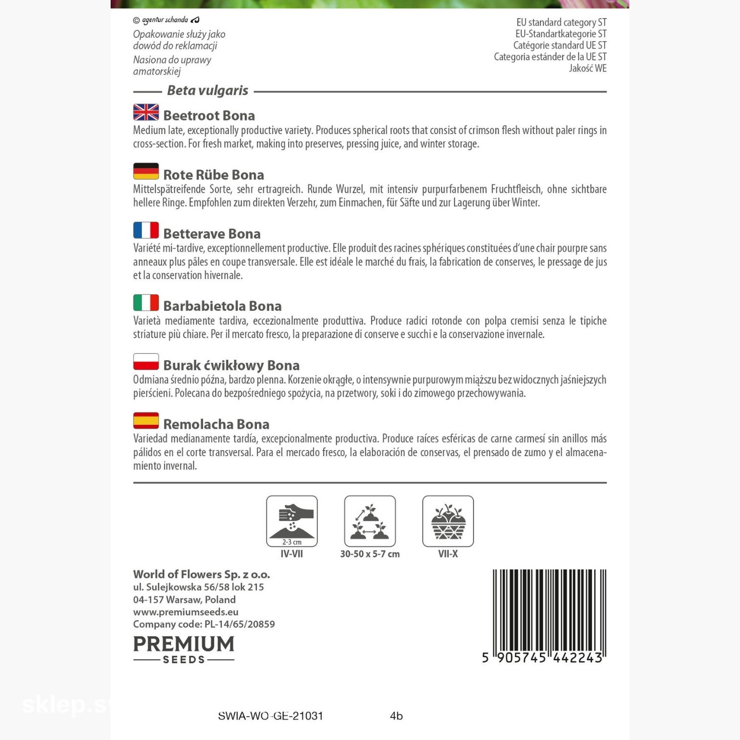 Burak ćwikłowy Bona to odmiana ceniona za plenność i znakomite walory smakowe. Wyróżnia się intensywnie purpurowym, gładkim miąższem, pozbawionym jaśniejszych pierścieni, dzięki czemu doskonale prezentuje się w sałatkach oraz przetworach, nadając potrawom głęboki kolor i wyrazisty smak. Ze względu na wszechstronność świetnie sprawdza się jako składnik soków, a także do zimowego przechowywania. Wysoka jakość nasion wspiera zdrowy rozwój roślin i obfite plony, co potwierdzają badania laboratoryjne. Sklep ogrodniczy Świat Kwiatów zapewnia szybką dostawę i bezpieczeństwo zakupów, co potwierdzają liczne pozytywne opinie klientów.