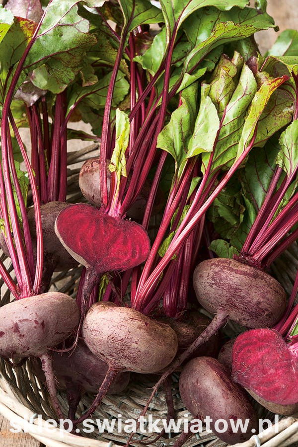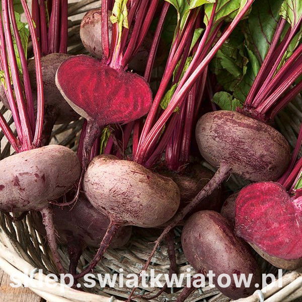 Burak ćwikłowy Egipski to klasyczna, ceniona odmiana o spłaszczonych, równych korzeniach w intensywnie ciemnoczerwonej barwie. Po przekrojeniu widoczne są jasne pierścienie, a gładka skórka kryje miąższ soczysty, delikatny i aromatyczny. Część nadziemną stanowi zwarta rozeta liści w odcieniach zieleni z czerwonymi lub purpurowymi żyłkami. Odmiana plonuje pewnie i równo, a zebrane korzenie dobrze znoszą przechowywanie, dzięki czemu przez całą jesień i zimę pozostają wartościowym składnikiem kuchni.