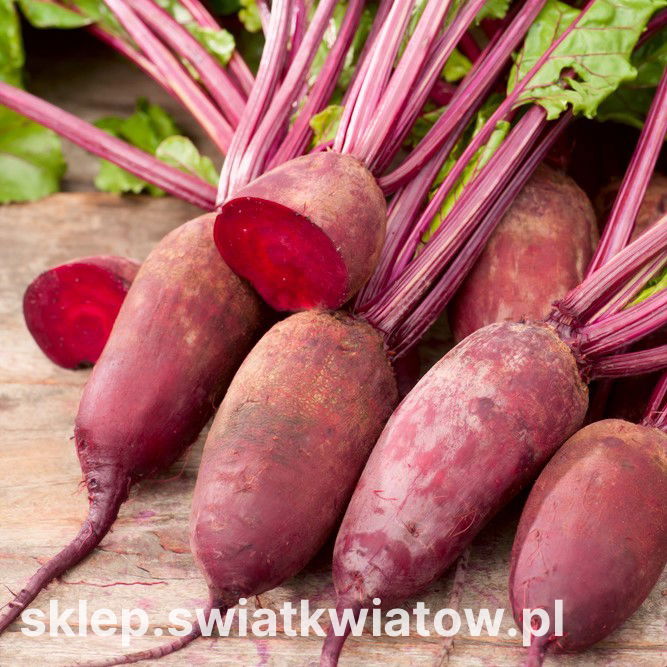 Burak ćwikłowy Renova to późna odmiana o wysokim plonie, tworząca cylindryczne, gładkie korzenie z jednolitym, rubinowym miąższem. Okres wegetacji wynosi około 130 dni, dzięki czemu korzenie dojrzewają stopniowo, zyskując pełny smak i naturalną słodycz. Miąższ jest jednolity i pozbawiony wyraźnych pierścieni, co sprawia, że estetycznie wygląda na przekroju i nadaje potrawom intensywny, głęboki kolor.