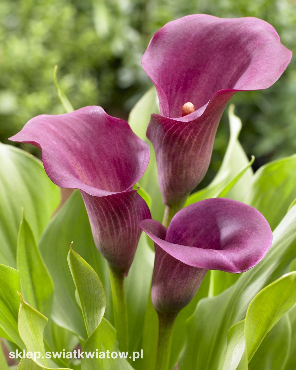 Calla (Zantedeschia) ‘Allure’ to wyjątkowo elegancka odmiana, która przyciąga uwagę intensywnie ciemną barwą kwiatostanów. Głęboki, bordowo-purpurowy kolor nadaje roślinie wyrafinowany charakter i doskonale wpisuje się w nowoczesne oraz klasyczne aranżacje. Smukłe, dekoracyjne kwiaty w połączeniu z błyszczącymi, zielonymi liśćmi tworzą efektowną całość, idealną zarówno do uprawy w donicach na tarasie i balkonie, jak i do nasadzeń rabatowych. To propozycja dla osób poszukujących rośliny o silnym akcencie kolorystycznym i wysokiej wartości ozdobnej.