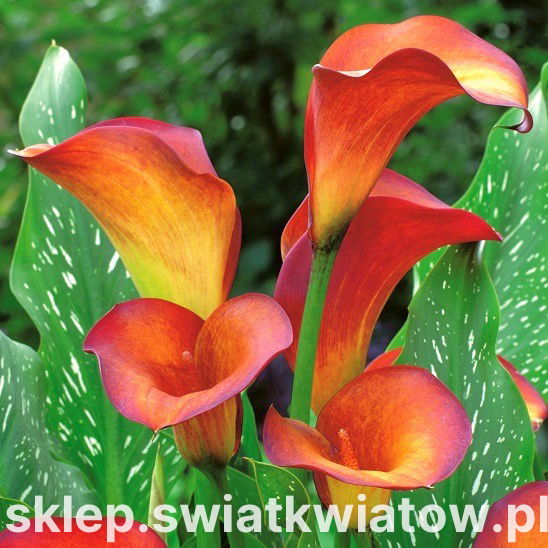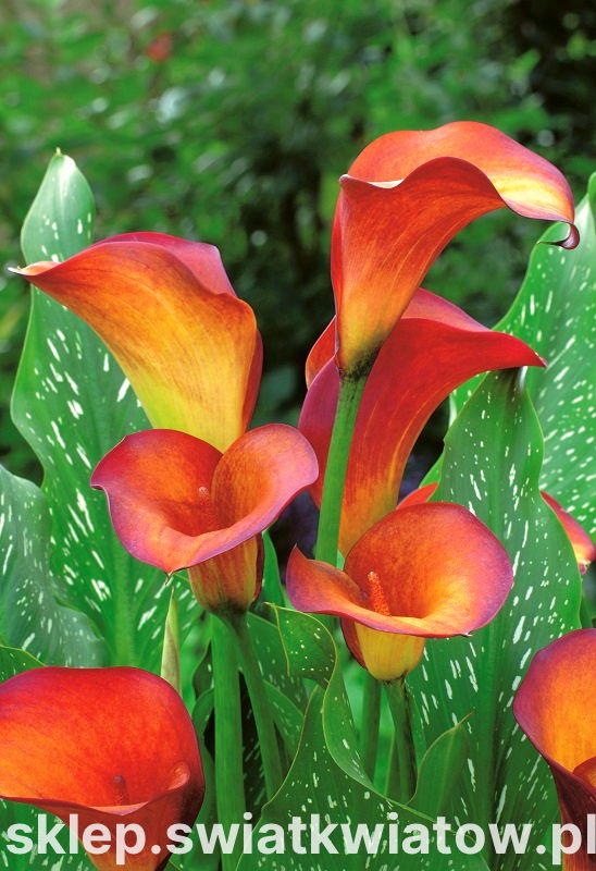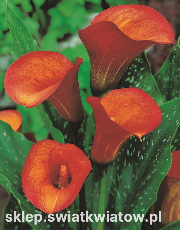 Calla Flame (Zantedeschia) to roślina o bardzo efektownych kwiatach, która można uprawiać w ogrodzie i w doniczkach. Odmiana Flame posiada iście ogniste kwiaty w intensywnym pomarańczowym kolorze, który na brzegach przechodzi w głęboką czerwień. Rośliny mają wzniesiony pokrój, tworzą okazałe zielone liście upstrzone białymi plamkami oraz mocny pęd zakończony kwiatem. Prezentowana odmiana dorasta do 35-40 cm wysokości. Wspaniałe kwiaty będą nas cieszyć swym pięknem od czerwca nawet do października. Calla będzie królową każdej ogrodowej kompozycji, idealnie nadaję się również do uprawy w pojemnikach, które mogą zdobić balkon, taras czy domowe wnętrze.