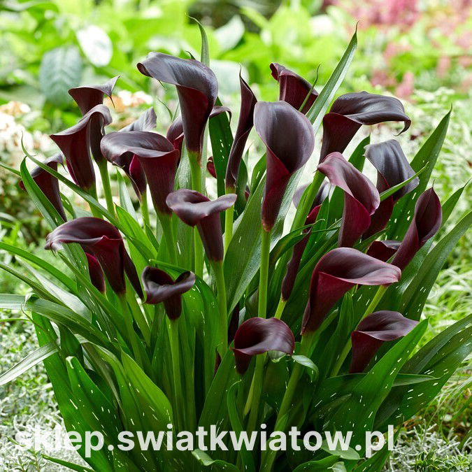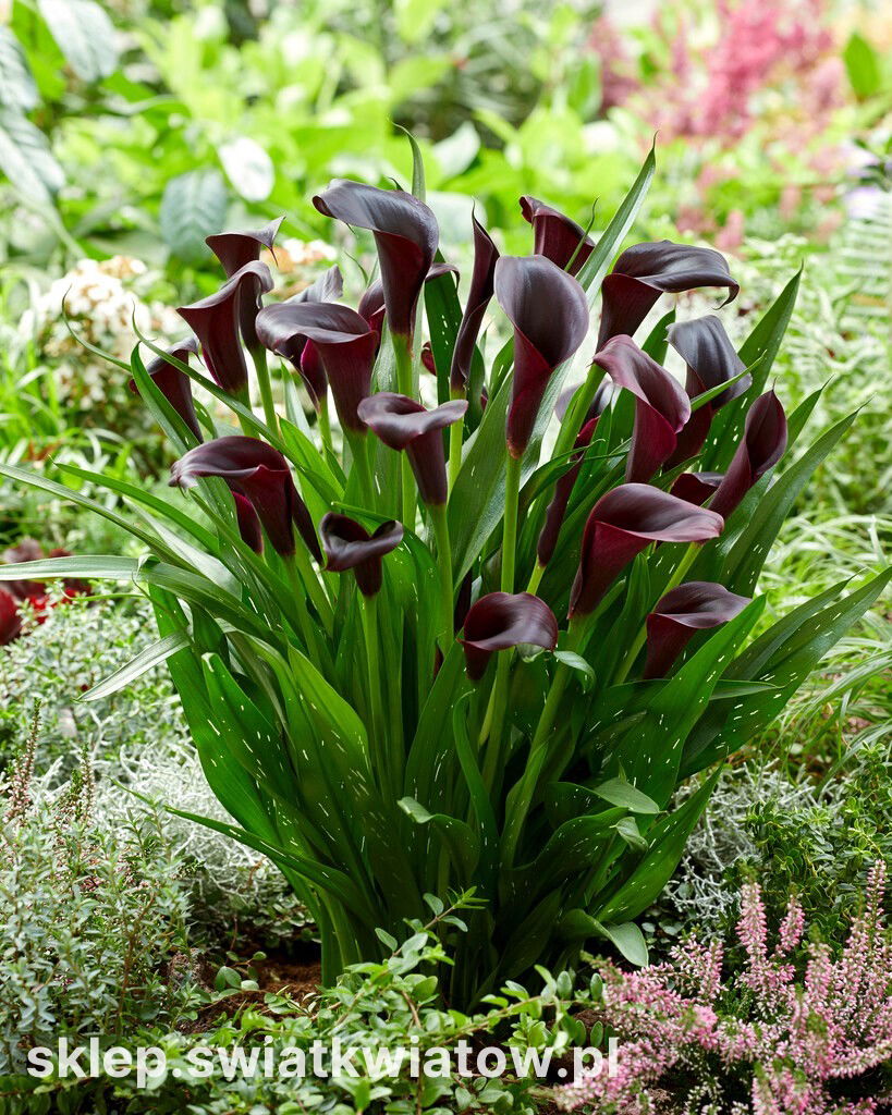Calla Odessa o trąbkowatych kwiatach w kolorze bardzo ciemnego fioletu to okaz o wszechstronnym zastosowaniu. Można ją uprawiać jako domową roślinę doniczkową, wysadzać latem na rabaty lub poświęcić jej uprawę na bardzo trwałe kwiaty cięte. Mierząca około 30-40 cm calla pochodzi z Afryki Południowej. Zwarty, dość gęsty, wyprostowany pokrój kęp tej rośliny jest bardzo elegancki i świetnie wygląda zarówno w doniczkach i skrzynkach, jak i w kompozycjach gruntowych. Kwiaty calli są nieco minimalistyczne, ale to właśnie prostota jest ich wielką zaletą. Calla Odessa i w unikatowym, niemal czarnym kolorze to fantastyczna propozycja na nietradycyjny kwiat do domu i ogrodu.