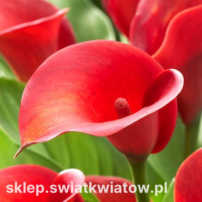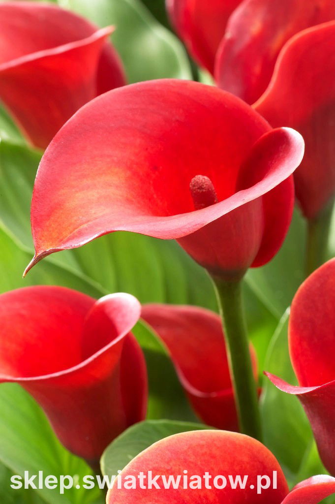 Calla Red Alert (Zantedeschia) o pochewkach liściowych w odcieniu wiśni to wspaniała, nadzwyczaj szykowna odmiana egzotycznej cantedeskii. Ta dorastająca do 30-40 cm roślina wieloletnia cechuje się wzniesionym pokrojem, a jej okazałe liście są nie mniej dekoracyjne niż kwiatostany. Owalne i spiczasto zakończone lub strzałkowate w zarysie liście wybijają na długich ogonkach i wznoszą się w górę tak jak pęd kwiatowy. Mają szmaragdowozielony kolor, a całą ich powierzchnię pokrywają drobniutkie, białe plamki. Ponad poziomem liści dumnie prezentuje się okazały, smukły, otwarty kielich – pochewka liściowa, która otacza kwiatostan właściwy w formie krótkiej kolby. Przepiękny, ciemnoczerwony kolor pochewki wspaniale współgra z płomiennym oranżem, widocznym we wnętrzu kielicha.