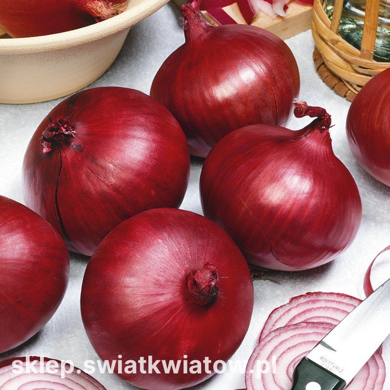 Cebula Karmen to ceniona odmiana o intensywnie purpurowoczerwonych łuskach i soczystym, wyrazistym miąższu, która wzbogaci każdy ogród warzywny. Delikatnie słodkawy smak sprawia, że doskonale nadaje się zarówno do dań świeżych, jak i po obróbce termicznej. Odmiana przeznaczona do długiego przechowywania - nawet do wczesnej wiosny - przy zachowaniu jędrności i walorów smakowych. Cebula Karmen dojrzewa średnio wcześnie, dzięki czemu pierwszymi zbiorami można cieszyć się już w środku lata. Oferowane nasiona są starannie wyselekcjonowane i przetestowane jakościowo, co przekłada się na wysoką zdolność kiełkowania i niezawodność w uprawie. Wygodne zakupy, sprawna i bezpieczna dostawa w sklepie Świat Kwiatów dopełniają satysfakcji z uprawy.