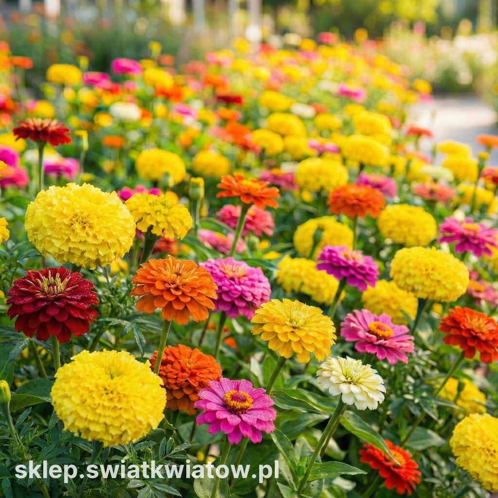 W skład zestawu wchodzą 2 odmiany nasion kwiatów: aksamitka pełna wysoka Mary Helen - cytrynowożółta, Cynia wytworna daliowa - mieszanka.