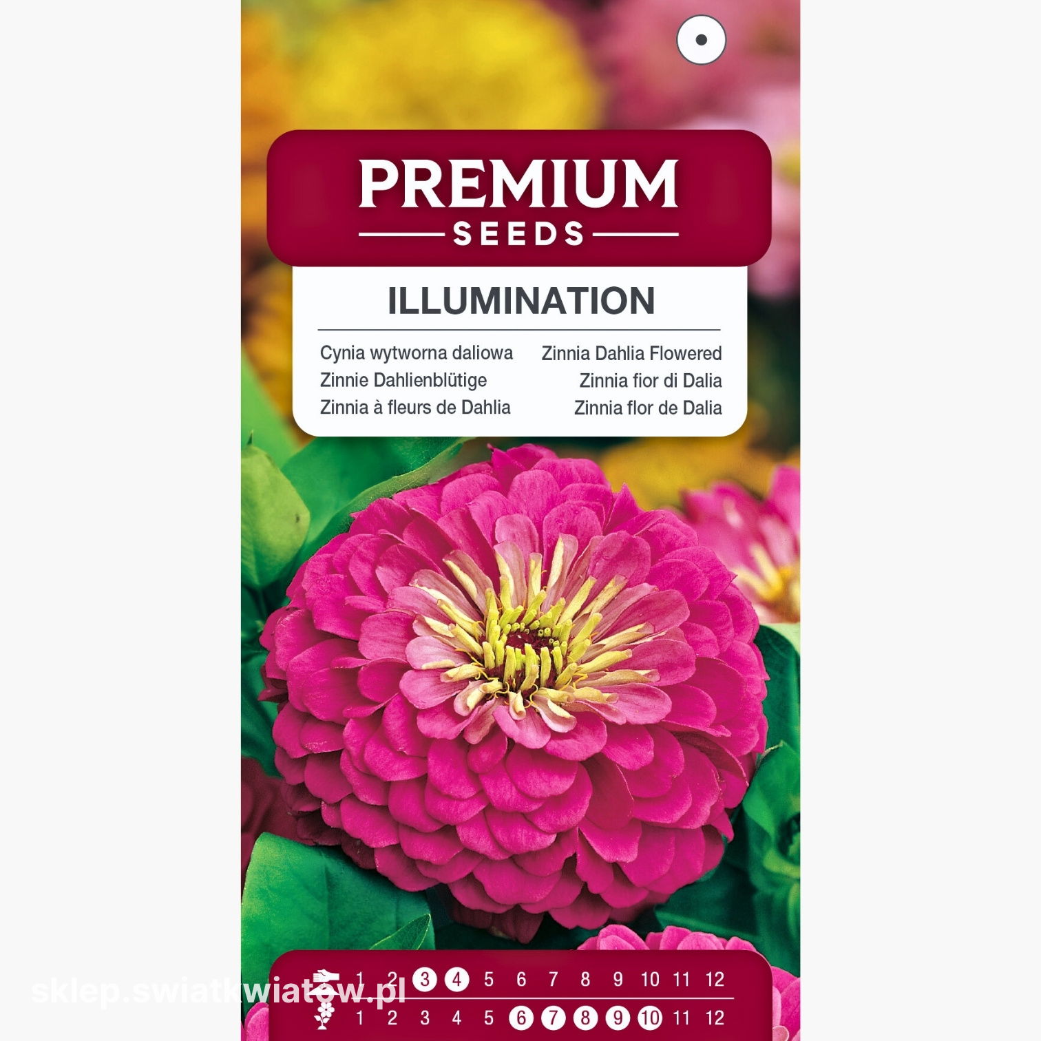 Cynia wytworna daliowa Illumination to efektowna jednoroczna odmiana o sztywnych, dobrze rozgałęzionych pędach dorastających do około 60-90 cm wysokości. Tworzy duże, pełne kwiaty o intensywnie różowej barwie, które długo utrzymują się na roślinie i wyraźnie wyróżniają się na rabatach. Kwitnie obficie, zapewniając stały efekt dekoracyjny przez całe lato i początek jesieni. Cynia doskonale sprawdza się na rabatach, w kwietnikach i kompozycjach jednorocznych. Jej kwiaty świetnie nadają się także do cięcia – w wazonie zachowują świeżość przez wiele dni, tworząc trwałe i wyraziste bukiety.
