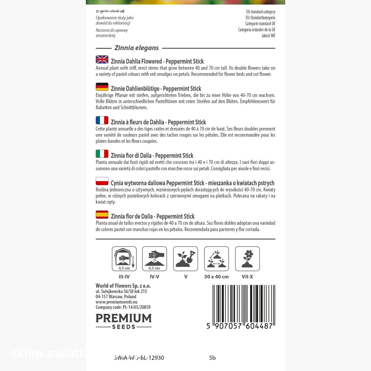 Cynia wytworna najlepiej czuje się na stanowiskach słonecznych i w glebie żyznej, przepuszczalnej, lekko wilgotnej, ale nie podmokłej. Roślina jest odporna na krótkotrwałe susze i nie wymaga skomplikowanej pielęgnacji. Wysiane wczesną wiosną nasiona szybko kiełkują, a młode sadzonki po przesadzeniu rosną silne i zdrowe. Regularne usuwanie przekwitłych kwiatów zachęca cynię do tworzenia nowych pąków, dzięki czemu kwitnienie trwa znacznie dłużej. Warto również przyciąć pierwszy pąk główny - sprzyja to rozkrzewianiu się i zwiększa liczbę kwiatów. Cynia Peppermint Stick to idealna roślina dla miłośników barwnych, radosnych ogrodów, którzy szukają połączenia piękna z łatwością uprawy.