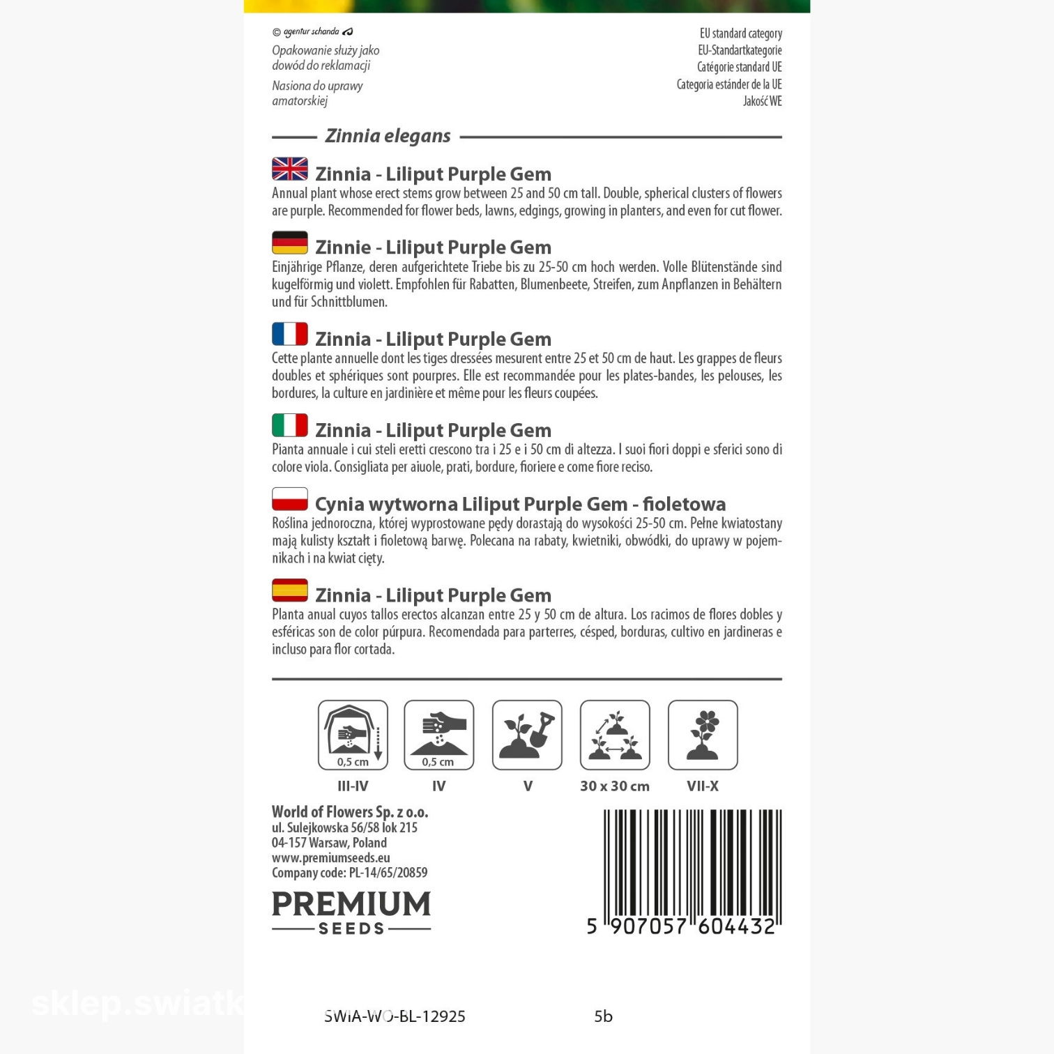 Opakowanie zawiera 0,5 g nasion. Na opakowaniu znajdziesz informacje o zasadach uprawy i terminie przydatności do wysiewu.