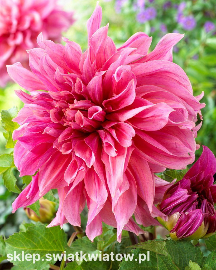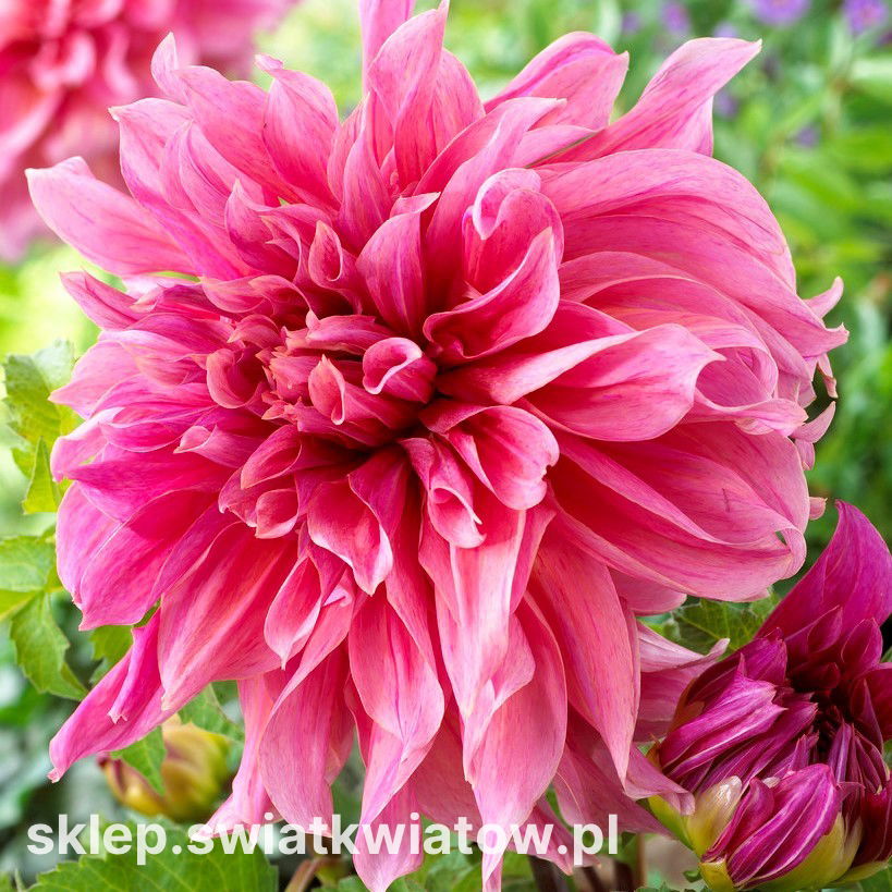 Dalia Maki to odmiana o imponującym rozmiarze kwiatów. Roślina o zwartym, krzaczastym pokroju rewelacyjnie zdobi ogród, od późnego lata do jesieni. Liczne kwiaty o fenomenalnej średnicy ponad 20 cm, pokryte są smugami ciemnego różu na jaśniejszym tle. Wysokie, mierzące 100-120 cm pędy, gęsto pokrywają intensywnie zielone, powcinane liście. Ich jednolita barwa znakomicie podkreśla pstrokate koszyczki kwiatowe. Dalia Maki to roślina niezwodna w długości i obfitości kwitnienia. Okazałe krzaki z olbrzymimi kwiatami są niesamowitym widokiem w ogrodzie. Ten piękny gatunek wart jest zasadzenia na tle budynków, ogrodzeń czy altan. Kwitnący żywopłot będzie też bardzo przyjemnym elementem otoczenia kącików wypoczynkowych i trasów, gdzie stworzy klimatyczną, indywidualną atmosferę. Kwiaty dalii można ścinać na efektowne bukiety i dekoracje. Atrakcyjny wygląd świeżych kompozycji utrzymuje od 5 do 10 dni.