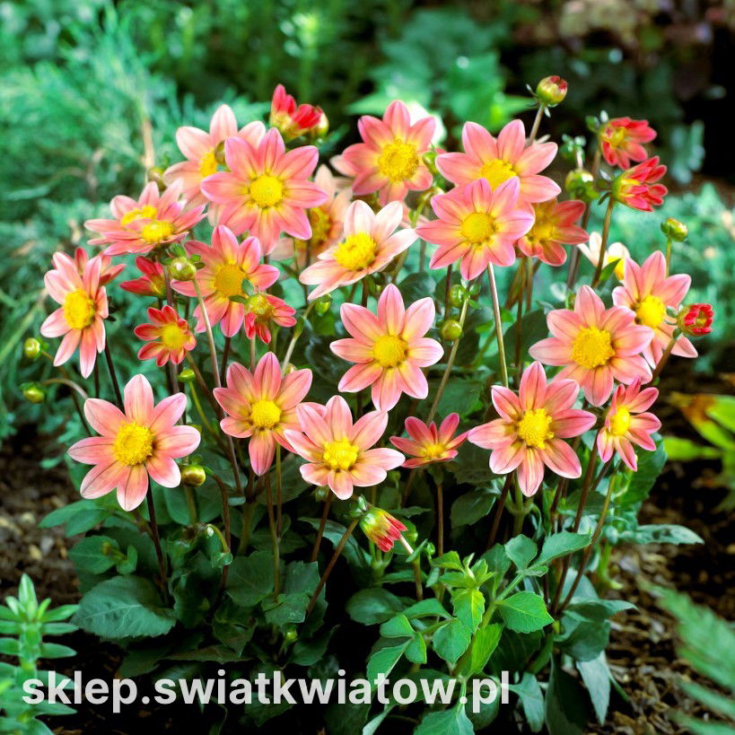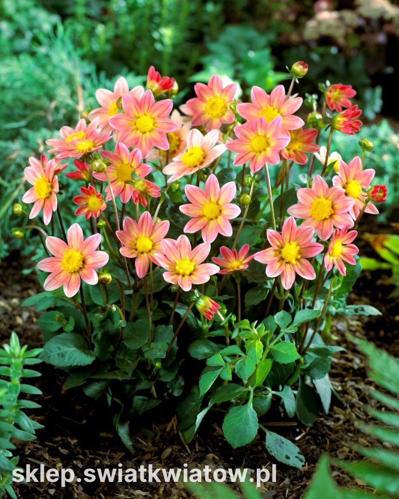 Dalia Topmix Salmon to jedna z najniższych odmian tego gatunku. Kwitnie długo i obficie, znakomicie spisuje się w roli rośliny do donic i skrzynek czy do formowania obwódek. Dalia Topmix Salmon zachwyca prostotą i subtelnym urokiem. Pojedyncze kwiaty, zbudowane z 7-10 owalnych płatków i wypukłych, żółtych środków pięknie wyglądają na tle bogatego ulistnienia. Dalia z serii Topmix ma bardzo atrakcyjny, krzaczasty pokrój, dzięki któremu prezentuje się nadzwyczajnie w zwartych obramowaniach rabat i wielobarwnych, wzorzystych klombach. Karłowe dalie (do 35 cm) zdobywają ogród w drugiej połowie lata. Ich towarzyszami pozostają zazwyczaj rośliny jednoroczne, byliny swój okres kwitnienia mają już za sobą.