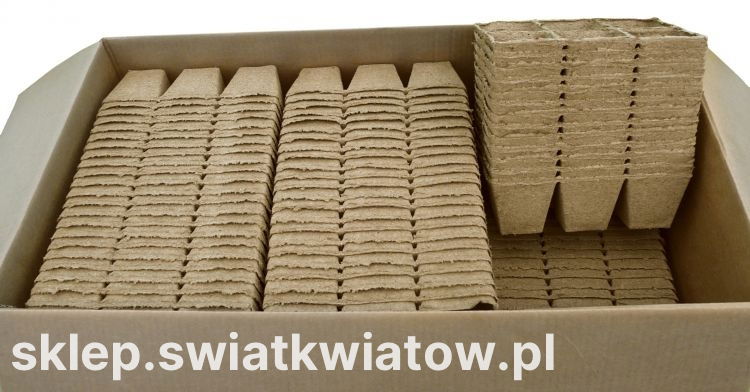 Zestaw doniczek torfowych o wymiarach 8 x 8 cm oraz 8 cm wysokości. W skład zestawu wchodzi 1242 kwadratowych doniczek w 207 częściach po 6 komórek.