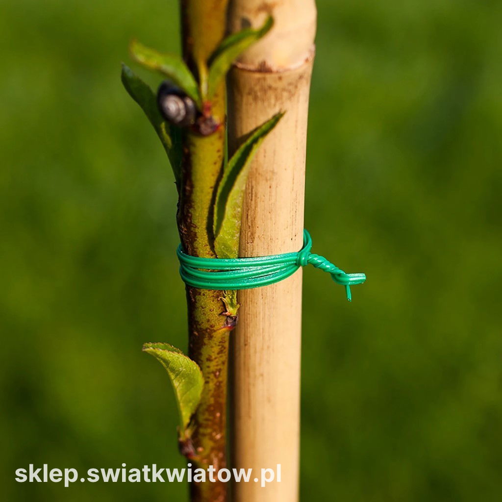 Płaski kształt ułatwia wykonanie podwiązania bez skomplikowanych wiązań. Drut można formować i dopasować do różnych podpór, a w razie potrzeby szybko poluzować lub założyć na nowo. To ważne, ponieważ pędy z czasem grubieją i podwiązania często wymagają korekty.