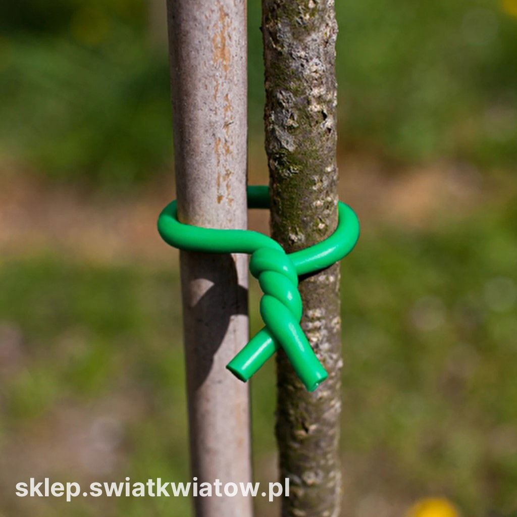 Otulina pełni funkcję ochronną. Ułatwia wykonanie podwiązania bez ostrego „cięcia” w pędzie i zwiększa komfort pracy. Drut lepiej trzyma się podpory, a jednocześnie jest przyjemniejszy w dotyku niż klasyczny, nieosłonięty metal. Dzięki temu łatwiej wykonać estetyczne mocowanie i szybko je poprawić, gdy roślina przyrasta.