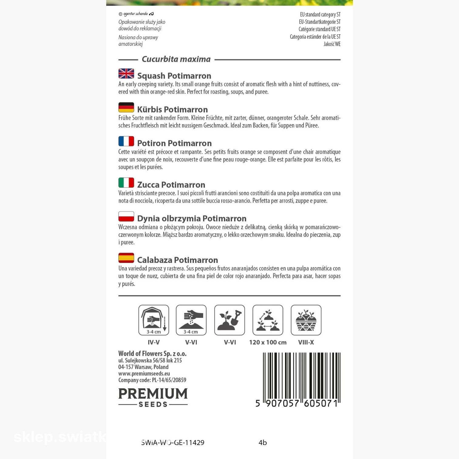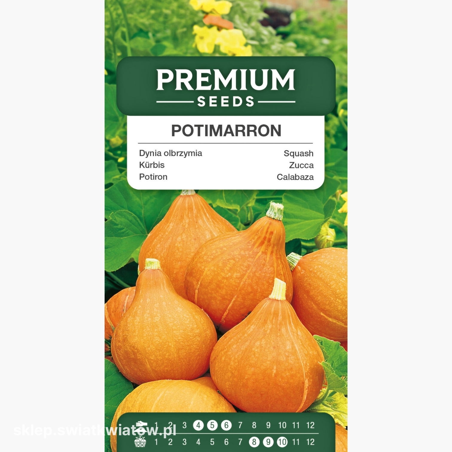 Dynia olbrzymia Potimarron to ceniona odmiana, która łączy doskonały smak z wysoką wartością użytkową i dekoracyjnym wyglądem. Jej skórka ma intensywny, pomarańczowoczerwony odcień, a miąższ charakteryzuje się wyjątkową gładkością, aromatem i delikatną, lekko orzechową nutą. Owoce są średniej wielkości, zazwyczaj osiągają masę 1–2,5 kg i mają cienką skórkę, dzięki czemu łatwo poddają się obróbce kulinarnej. Potimarron świetnie sprawdza się w kuchni – jej miąższ jest idealny do pieczenia, przygotowywania zup kremów, zapiekanek, sosów czy puree. Zachowuje strukturę i intensywność smaku, co sprawia, że potrawy z jej udziałem zyskują wyrazisty, jesienny charakter. Ozdobne, intensywne wybarwienie owoców sprawia, że odmiana ta doskonale nadaje się także do jesiennych aranżacji – zarówno w ogrodzie, jak i w dekoracjach tarasowych oraz stołowych.