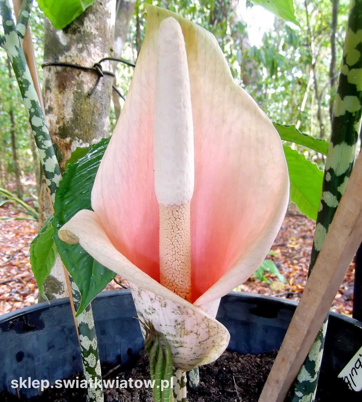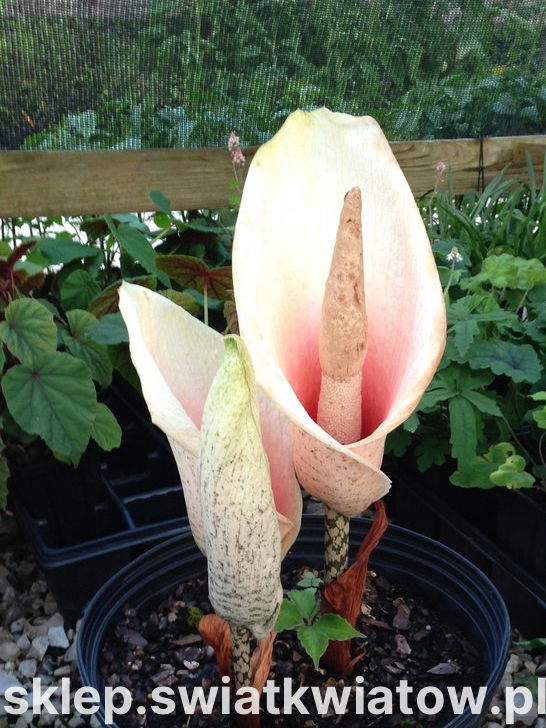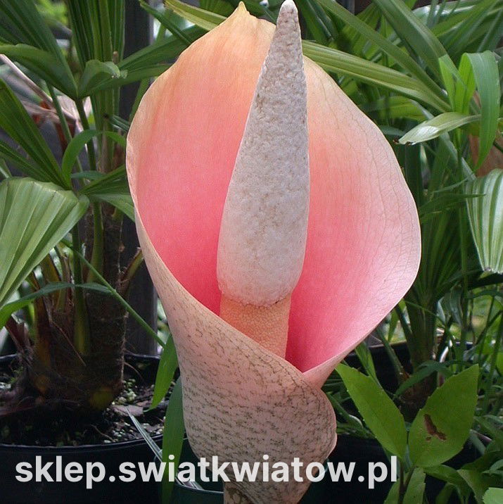 Dziwidło różowe (Amorphophallus bulbifer) to unikat, któremu dorównać może tylko lilia Voodoo. Proponowana roślina wykształca gruby, wysoki pęd, zwieńczony kwiatostanem w postaci kolby, w której osadzone są ściśle drobniutkie, kremowe kwiatuszki o silnym, charakterystycznym zapachu. Najwspanialszą dekoracją rośliny jest pochwa, otaczająca kolbę kwiatostanową – gładka i okazała, a przy tym zabarwiona na uroczy, jasnoróżowy kolor. Poza okresem kwitnienia dziwidło wypuszcza duży, pięciolistkowy, ciemnozielony liść, który również można potraktować jako nietypową ozdobę.