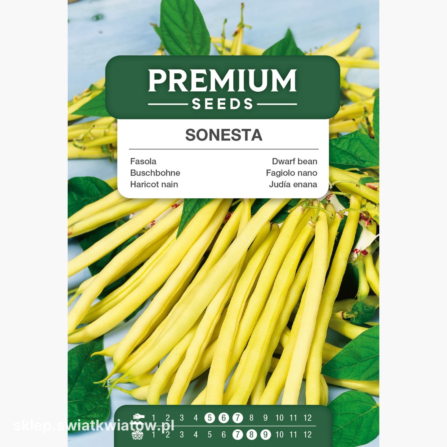Fasola Sonesta to ceniona odmiana szparagowa o zwartym, krzaczastym pokroju i równomiernym plonowaniu. Rośliny wytwarzają liczne, proste strąki o długości około 12 cm, wyróżniające się intensywnie żółtą barwą, delikatnym smakiem oraz całkowitym brakiem włókien. Mięsista struktura i wysoka jakość kulinarna sprawiają, że odmiana doskonale nadaje się do gotowania, mrożenia i konserwowania. Sonesta charakteryzuje się stabilnym wzrostem i dobrą tolerancją na zmienne warunki atmosferyczne, a także odpornością na najczęściej występujące choroby fasoli. Strąki dojrzewają stopniowo, co umożliwia wielokrotne zbiory w trakcie sezonu.