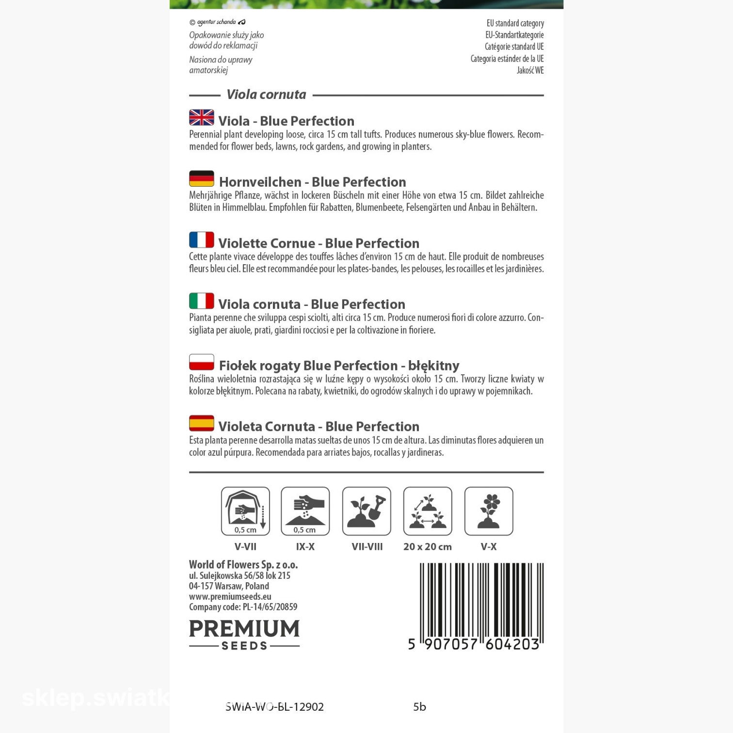 Fiołek rogaty Blue Perfection powinien być sadzony w rozstawie 20x20 cm. Taka odległość między roślinami zapewnia im odpowiednią przestrzeń do wzrostu i pozwala na swobodną cyrkulację powietrza, co jest ważne dla ich zdrowia i prawidłowego rozwoju.