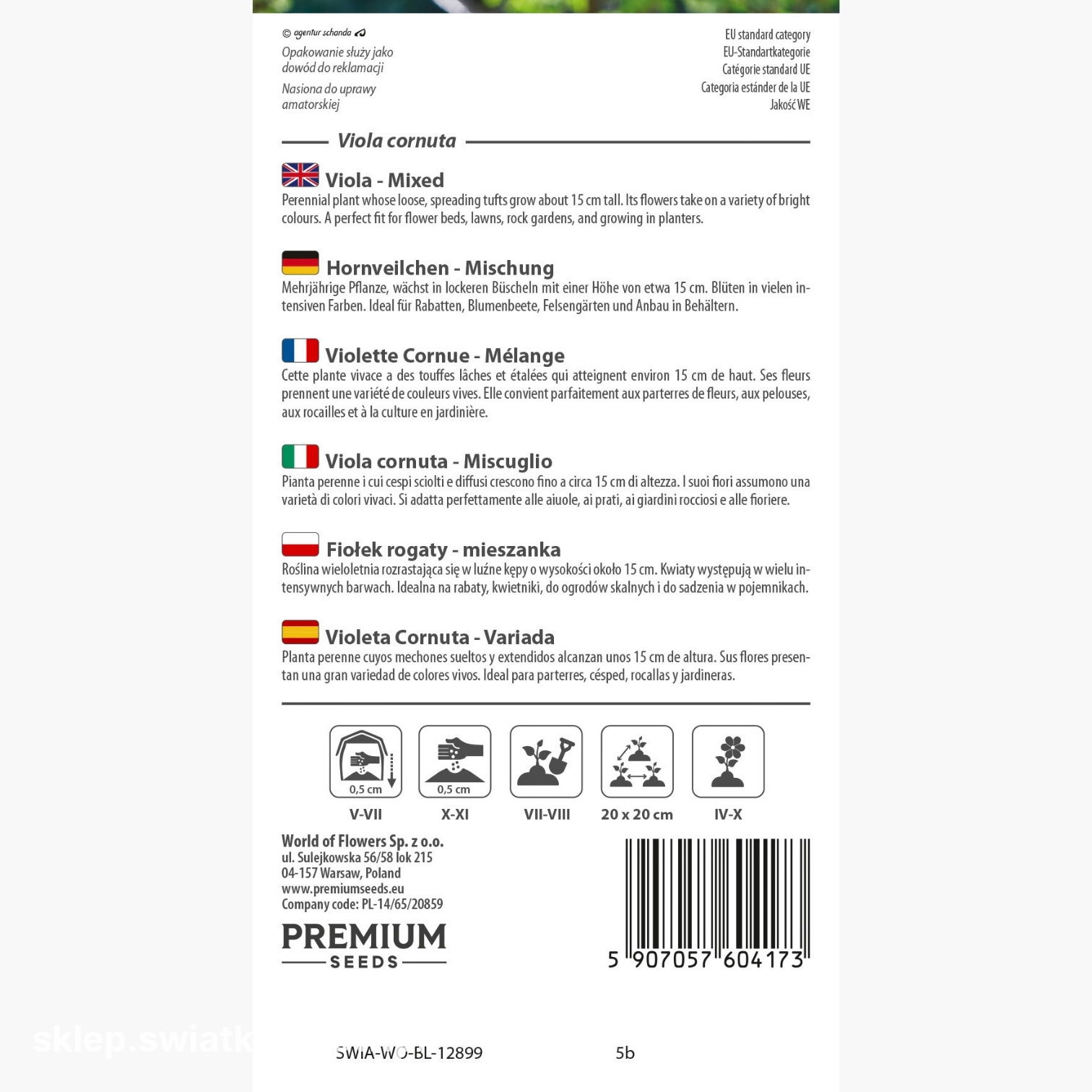 Mieszanka oferowana w naszym sklepie to starannie dobrane odmiany fiołka rogatego, gwarantujące niezwykle dekoracyjne kompozycje. Dzięki długiemu, obfitemu kwitnieniu od wiosny aż do późnej jesieni, roślina pozostaje efektowną ozdobą przez wiele miesięcy. Fiołek rogaty sprawdzi się zarówno w formie barwnej obwódki rabaty, jak i w pojemnikach, donicach czy skrzynkach balkonowych. Jest odporny, wdzięczny i niemal bezobsługowy.